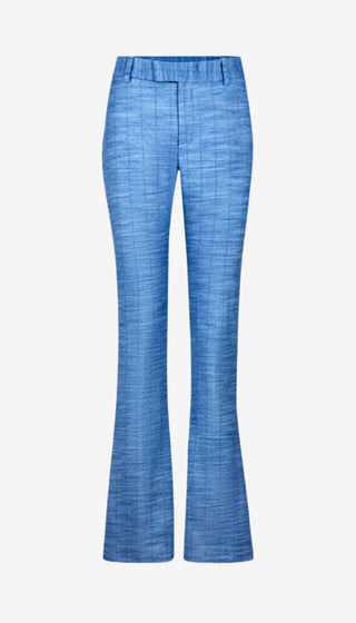 A seasonless denim, pair with its coordinating pant and vest for a directional suit. Closely tailored, this peaked lapel longline silhouette has double breasted button placements but is actually a single-breasted blazer in disguise. Curvy figures may wish to go up a size.