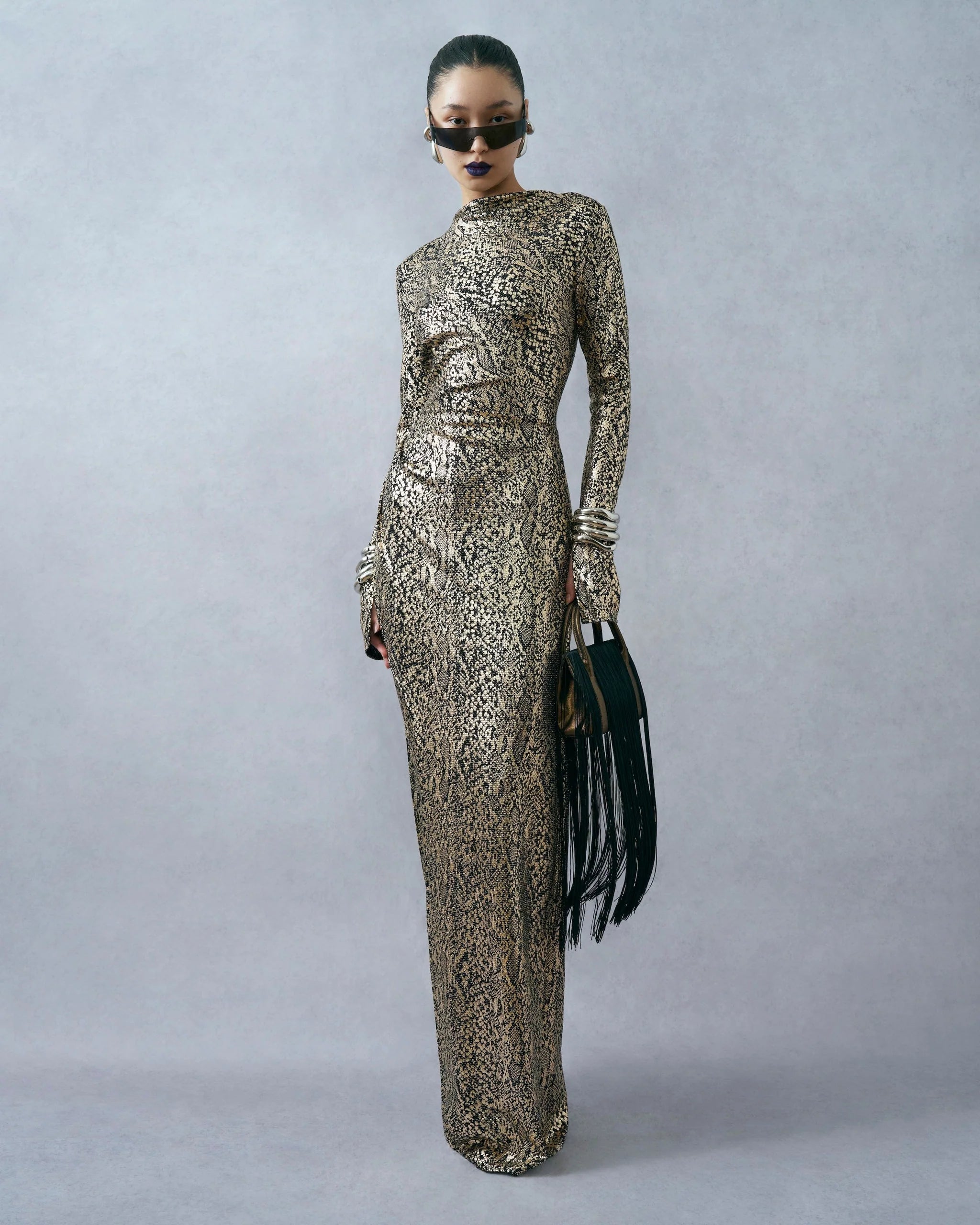 Long sleeve gown in our new metallic snake print fabric featuring ruching throughout.