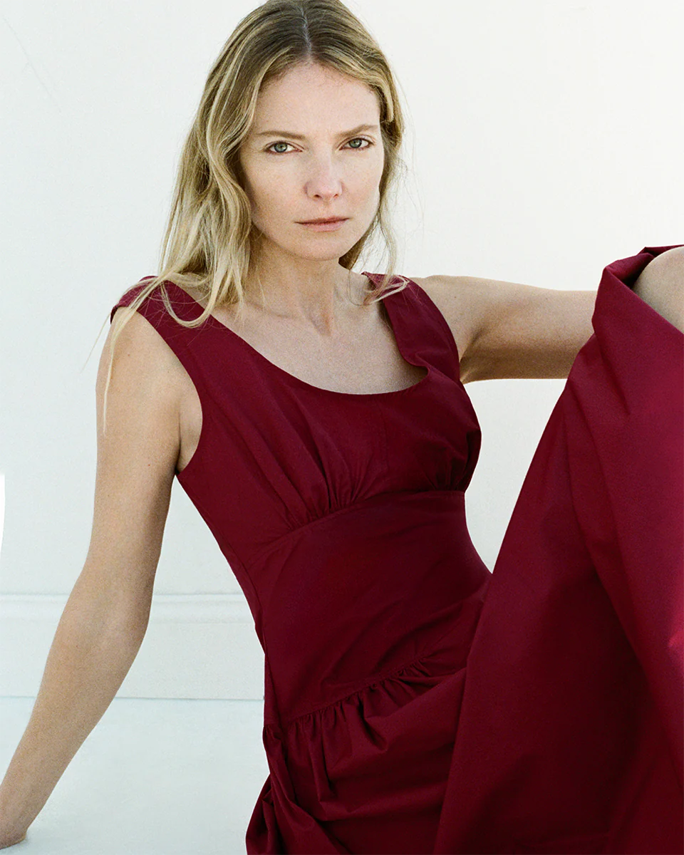 The Kendall Dress in Tech Cotton features a slim upper bodice with a scoop neckline, transitioning to a drop waist and mid-length skirt. Finished with on-seam pockets at side seam and side shirring that accentuate the silhouette.