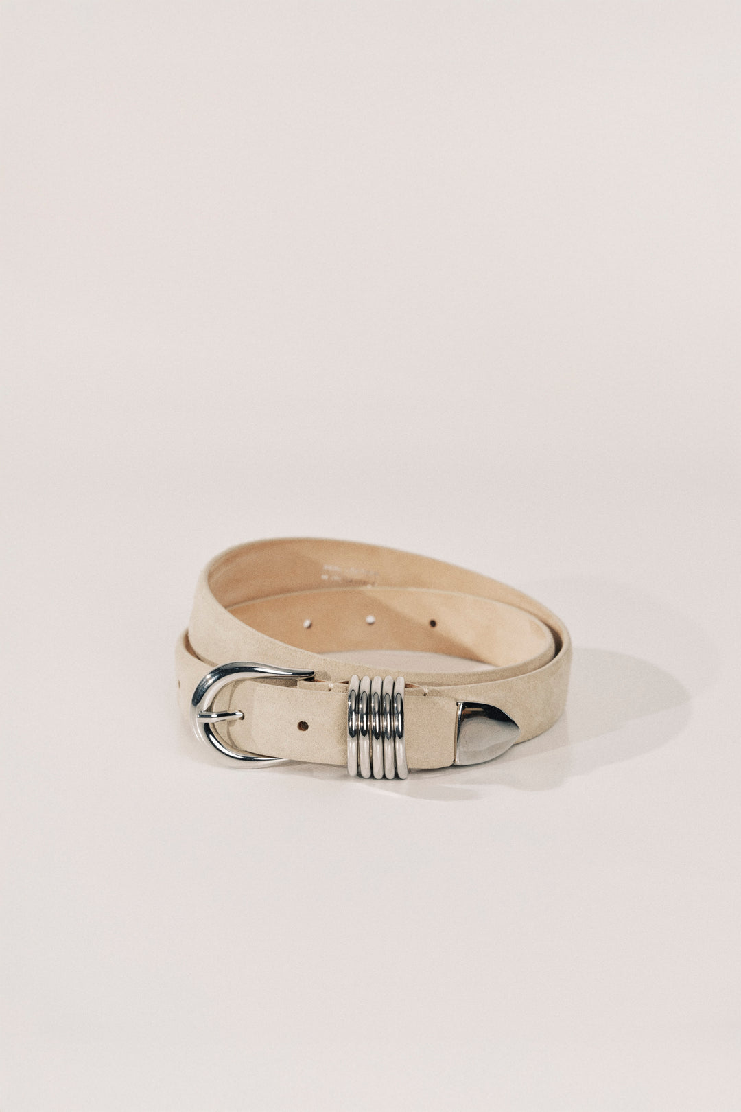 The debut style of Déhanche radiates a subtle yet sophisticated aesthetic that encapsulates the essence of polished dressing. The 5-ring belt is handcrafted in Italy from luxurious calfskin suede and signature beige suede lining.