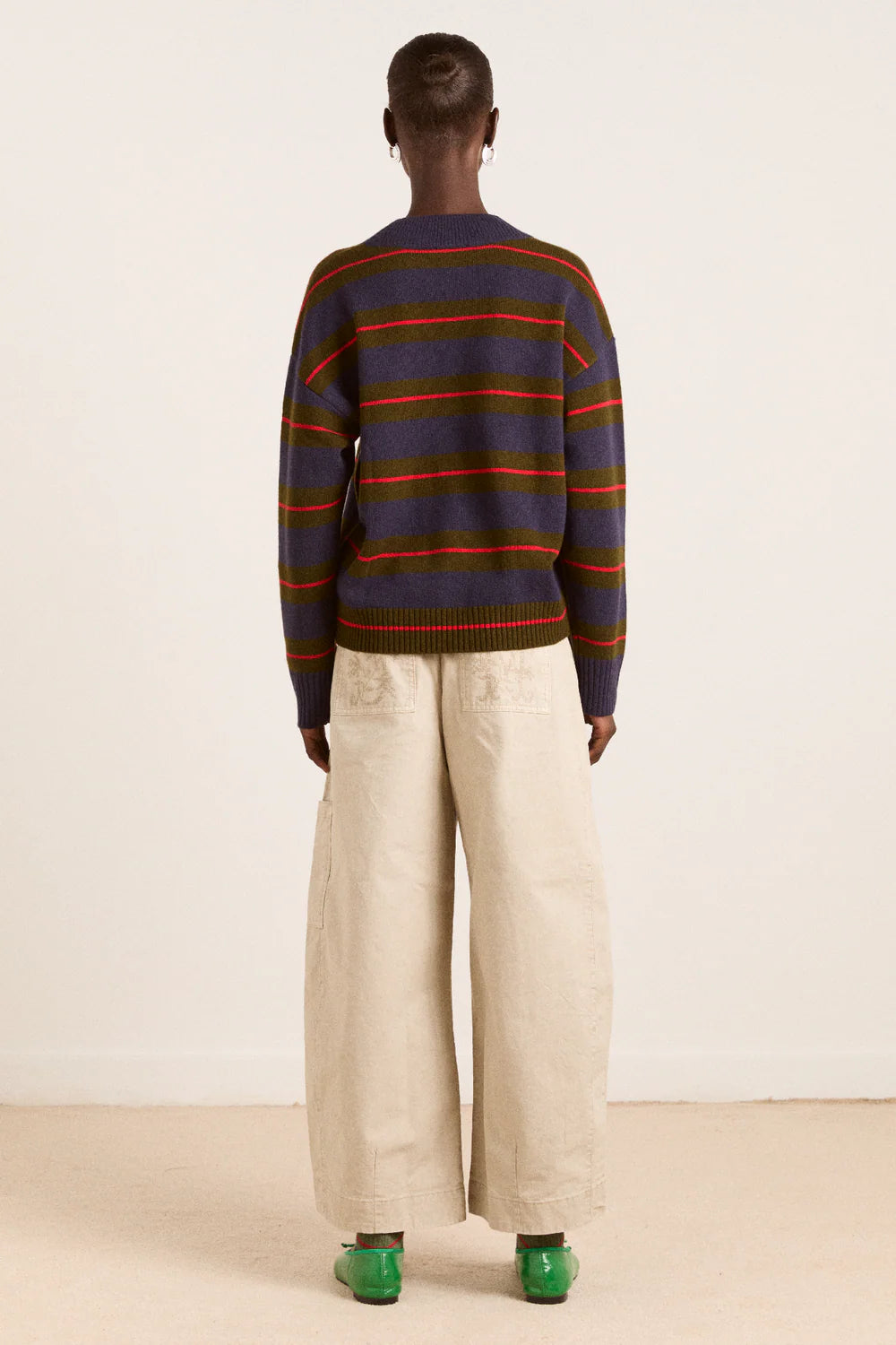A relaxed essential with a graphic edge, the Odette v Neck is a boxy-fit knit in certified responsible wool standard merino wool, featuring an all-over stripe pattern and a flattering V neckline, striking a balance between bold and understated. Finished with subtle “DM” embroidery on the body for a signature touch.