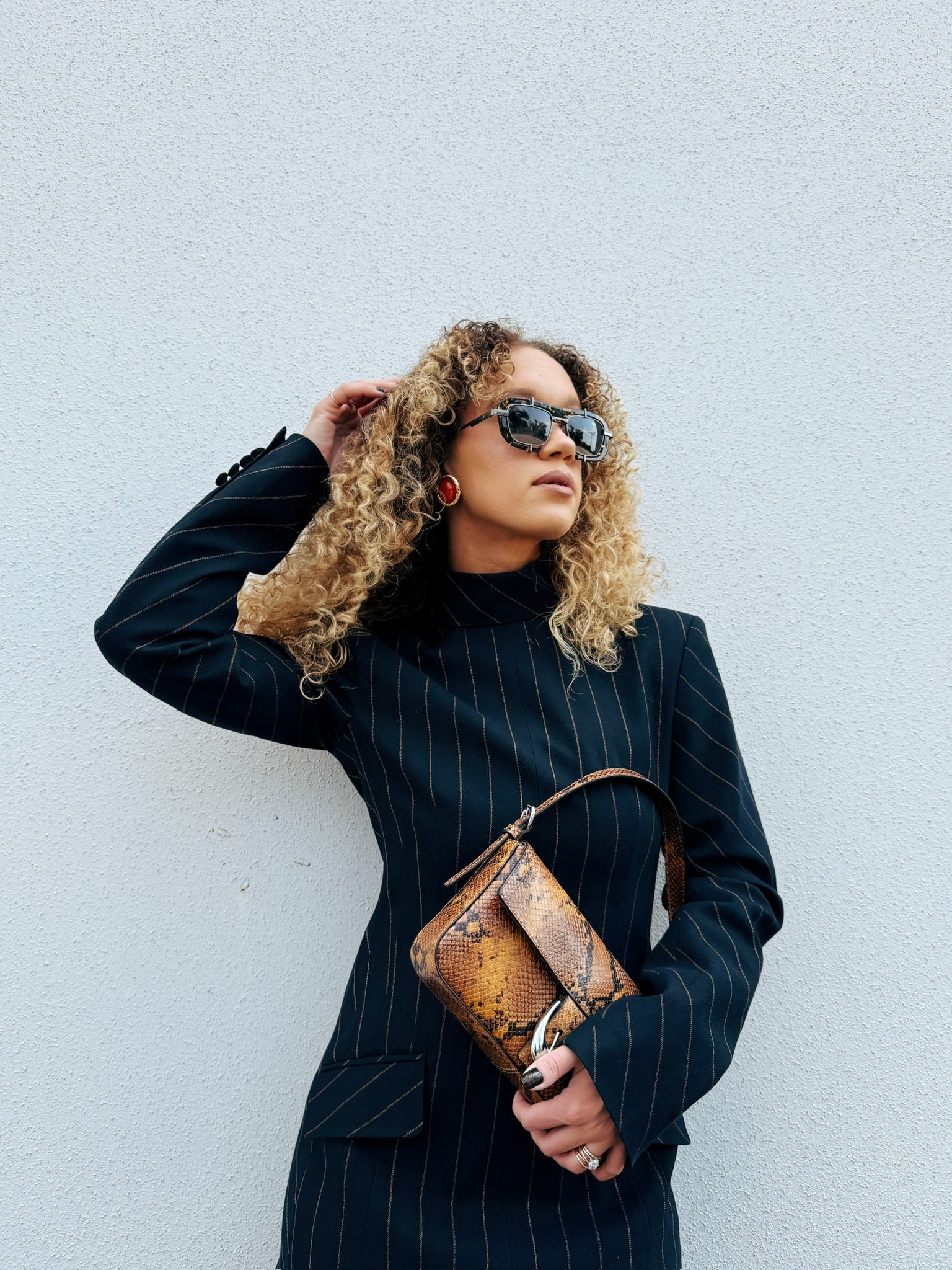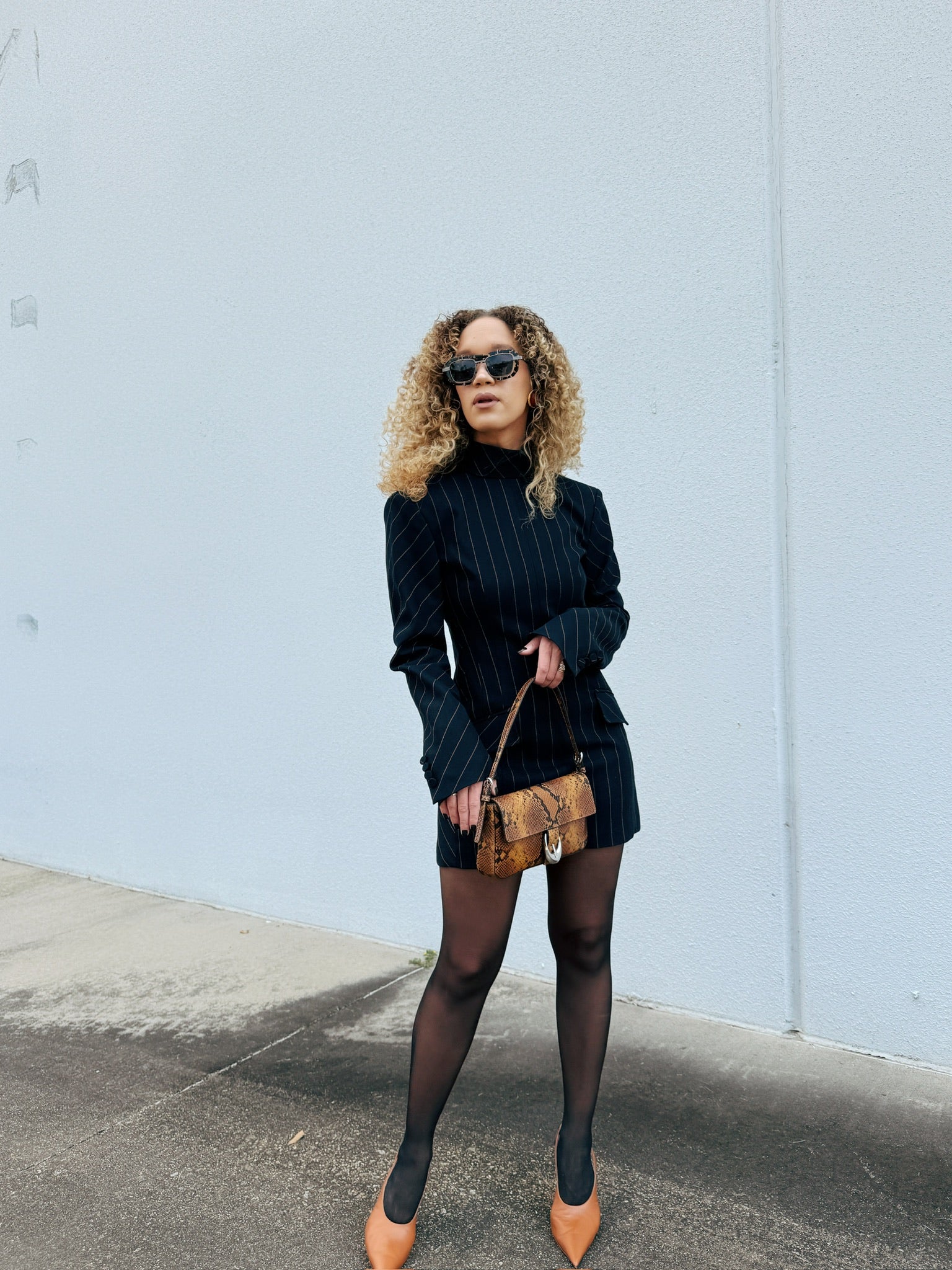 High collar navy pinstripe minidress with welt flap pockets, buttoned sleeves, paneled construction.