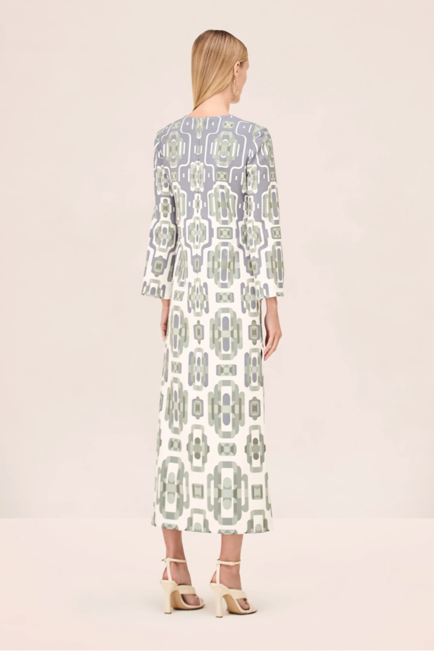 The Larissa Dress is a long-sleeve midi dress featuring a geometric print, a straight silhouette, and side slit detailing.