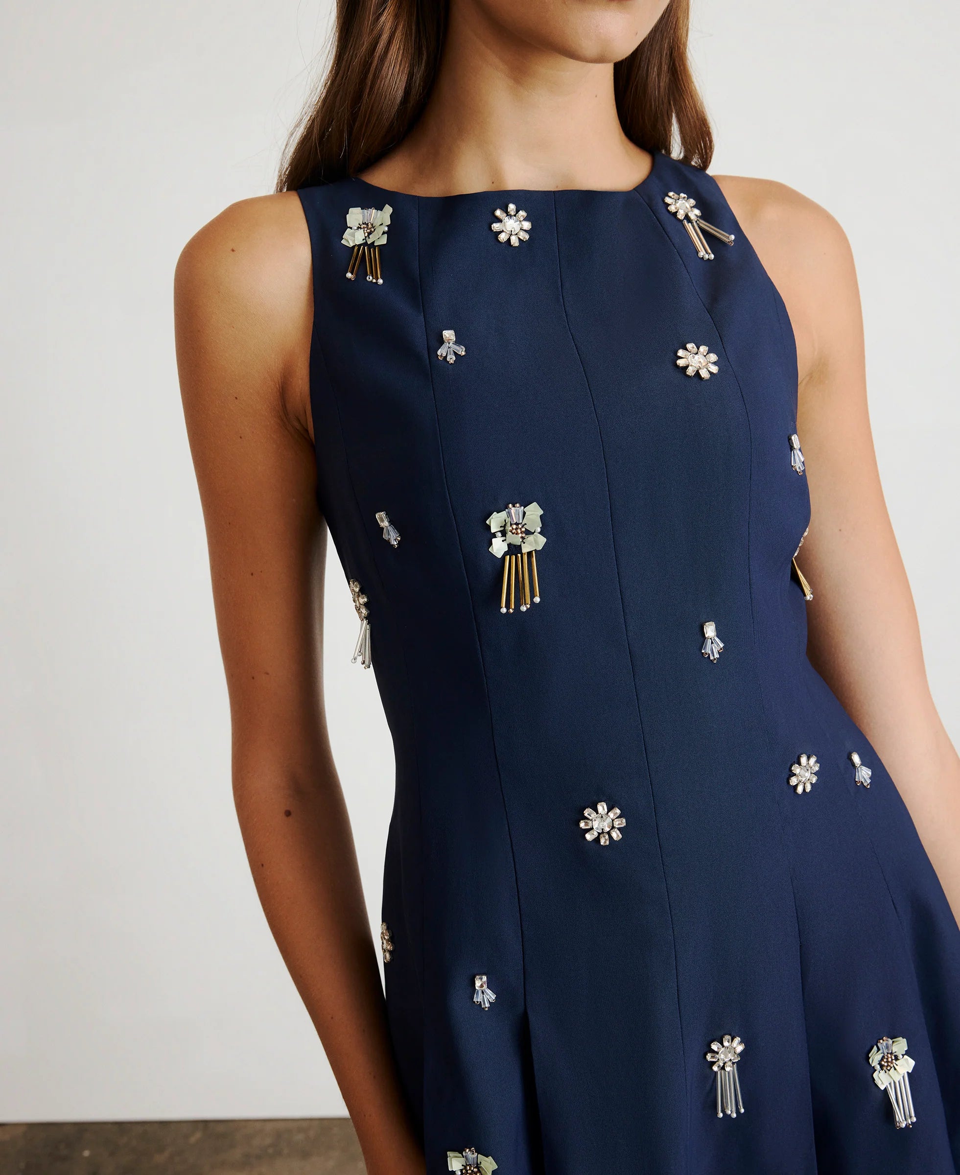 The Glenda Dress is our go-to event mini dress this season, elevated with fresh detail and just the right amount of attitude. Featuring a boat neck, paneled seaming, and a fit and flare silhouette with all over crystal drop embellishment, Glenda delivers a playful, feminine feel with an effortless evening shine.