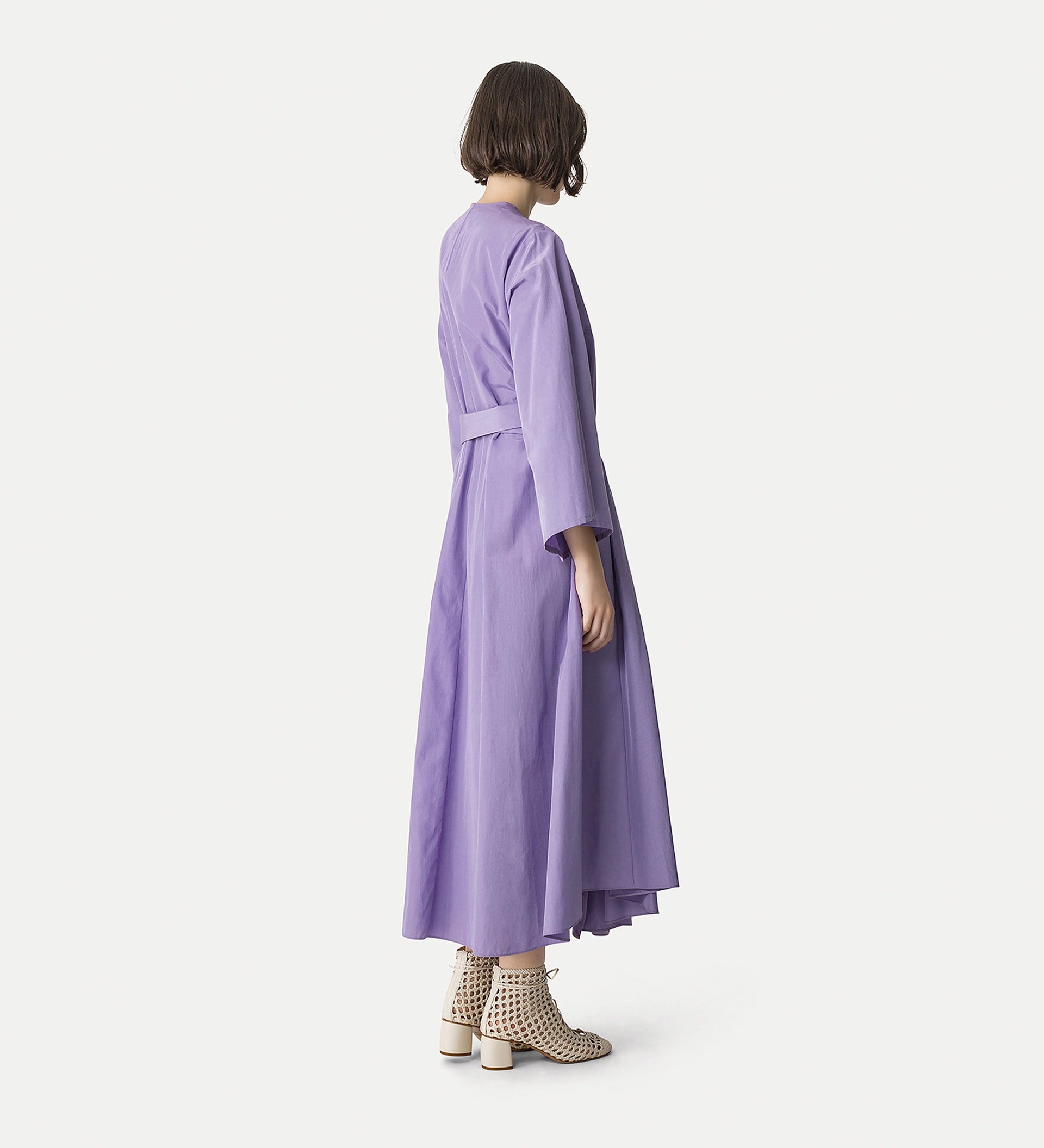 Capture the first spring blossoms with this chic taffeta dress: light, airy in the skirt, cinched at the waist with a sash, it creates a feminine, romantic silhouette enhanced by kimono—style sleeves. also perfect worn open over shorts and a tank top, this long—sleeved dress plays with volume and rich texture for a season defined by lightness.