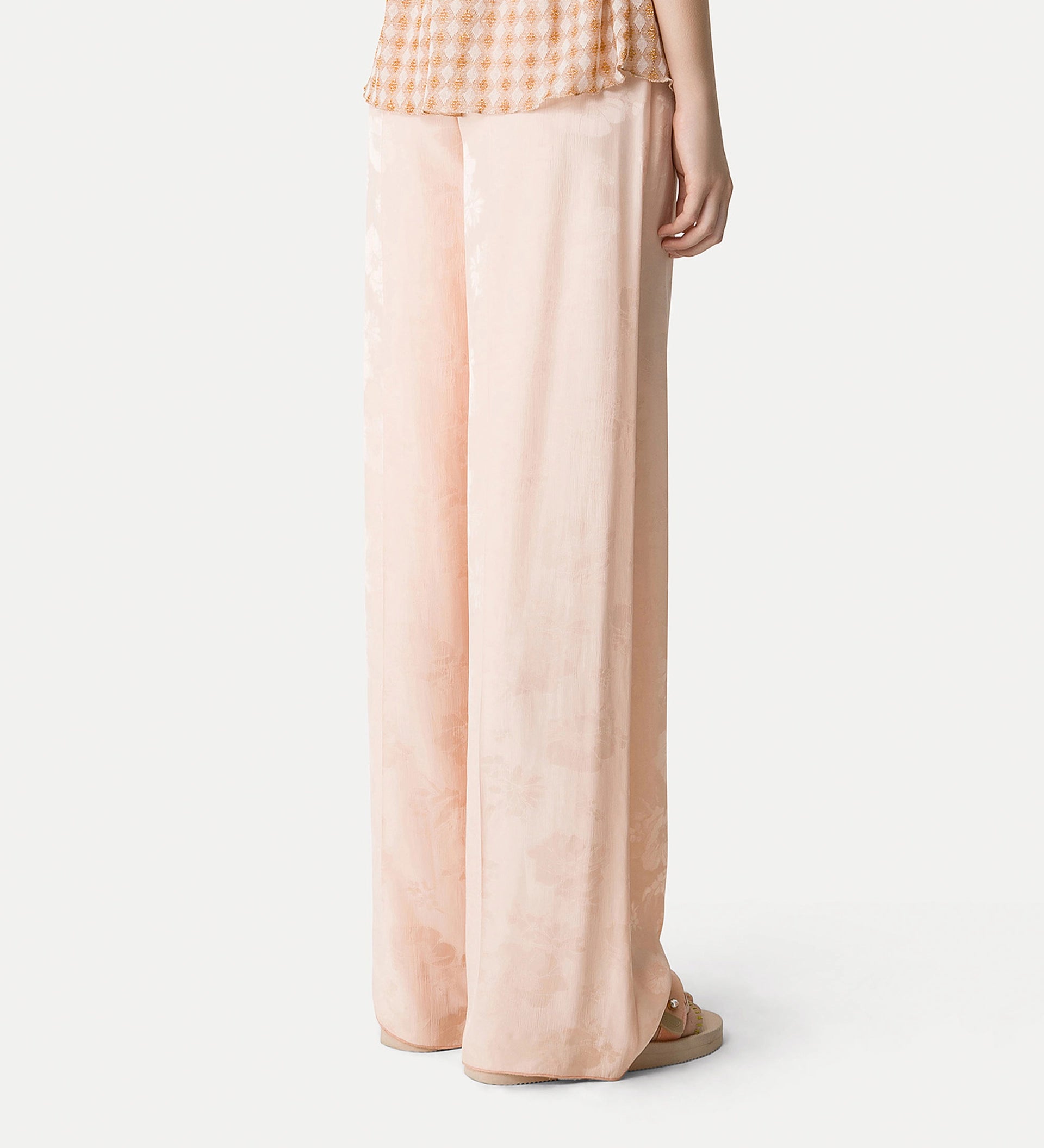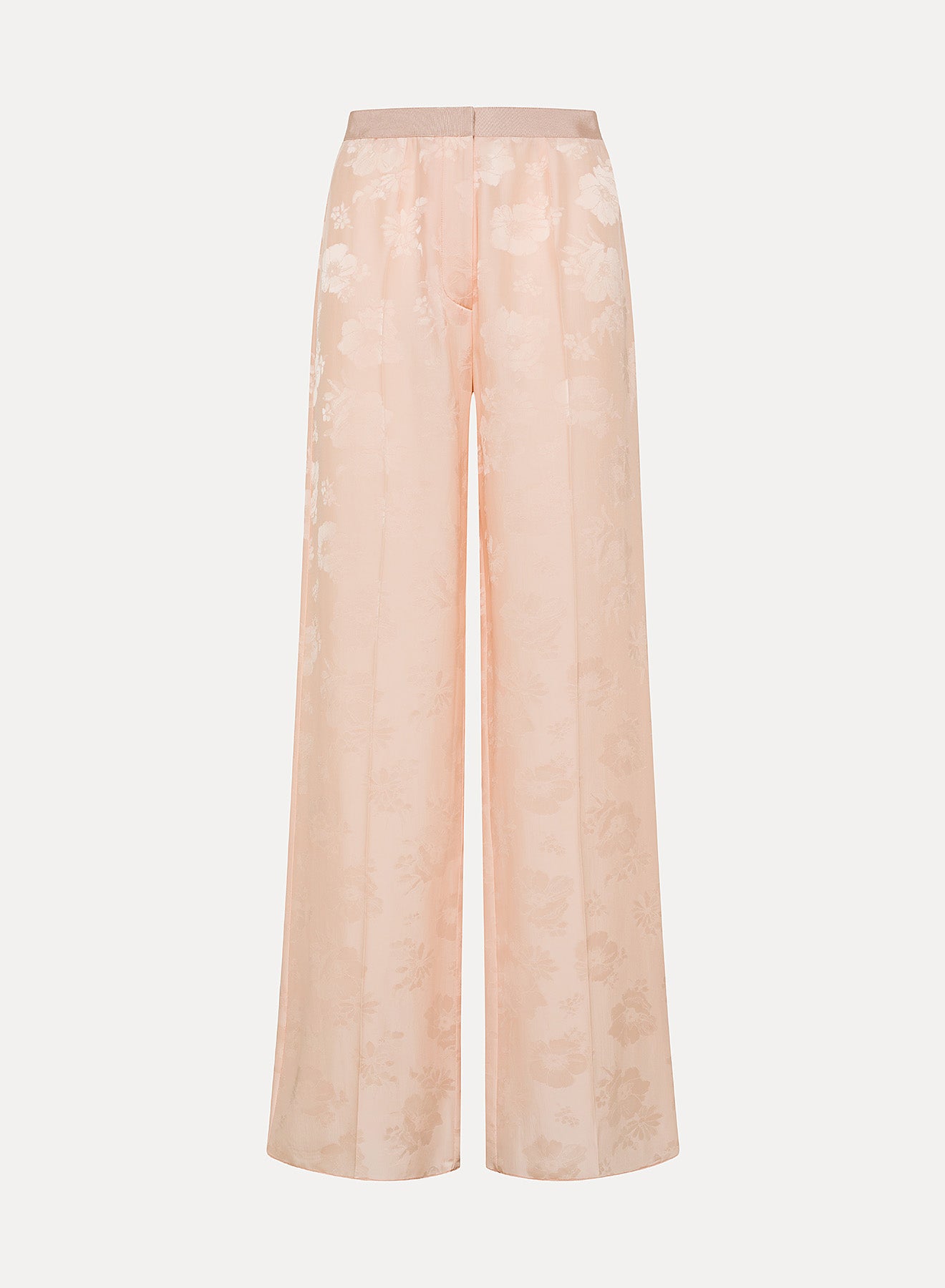 Jacquard trousers with a sophisticated allure — fluid and wavy along the leg, adorned with a delicate floral bouquet pattern gracefully placed throughout. the grosgrain waistband adds a refined accent to these high—waisted trousers