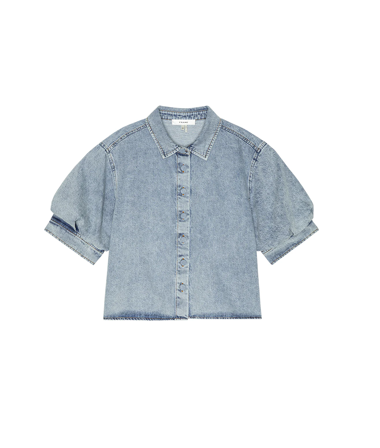 Designed for versatility, the Billow Sleeve Shirt features short puff sleeves and a lightweight denim chambray construction. The ultra-soft fabric drapes to the hip, while covered buttons add a refined finish.