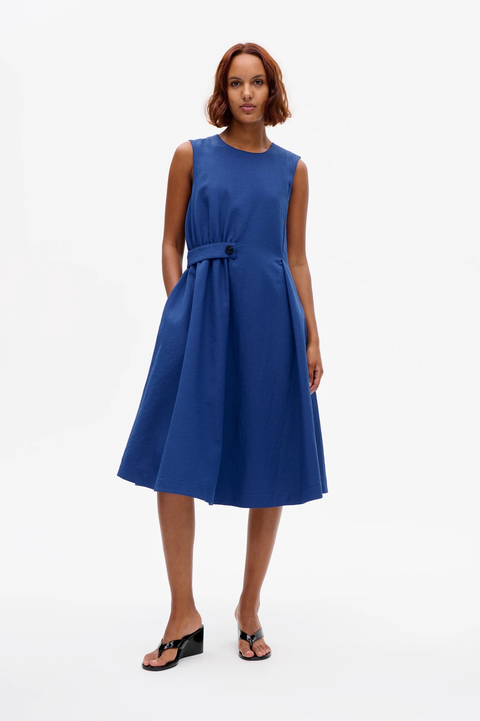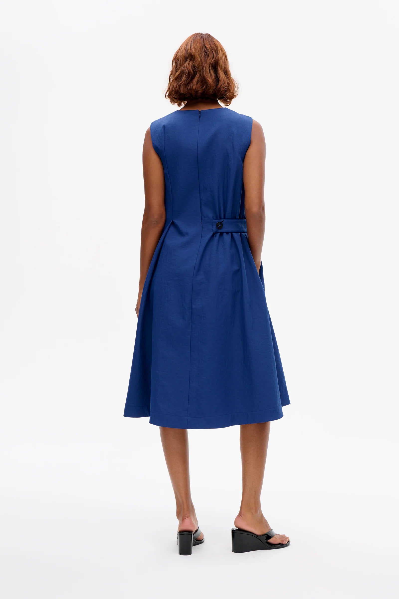 The Adiya Dress is a sleeveless midi dress. The dress has an A-shape that's fitted at the top with volume at the hem and an asymmetric detail at the waist.