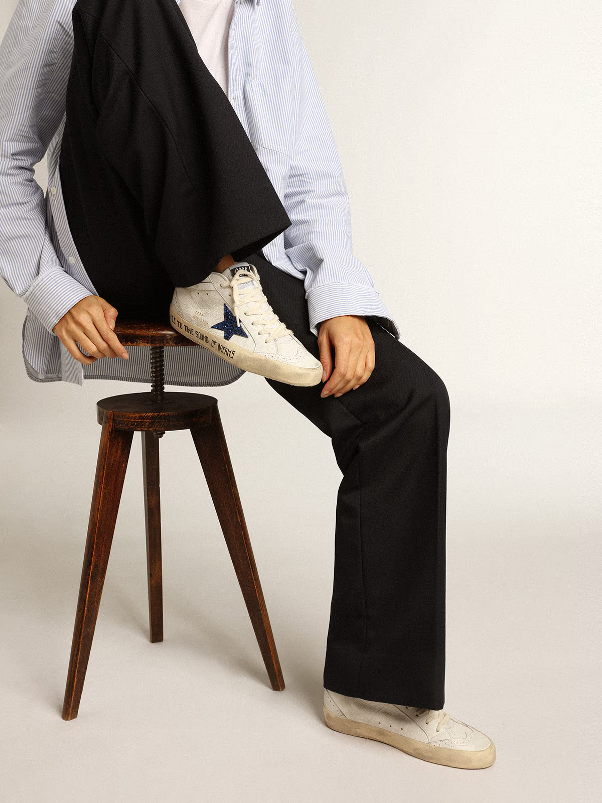 Uniquely elegant versatility: the Mid Star sneakers take a refined approach to their Nineties skate scene inspiration. This model with a white nappa leather upper features a blue glitter star and a glossy white leather flash. The pink suede heel tab, contrasting black lettering on the foxing and cream-colored laces complete the look.