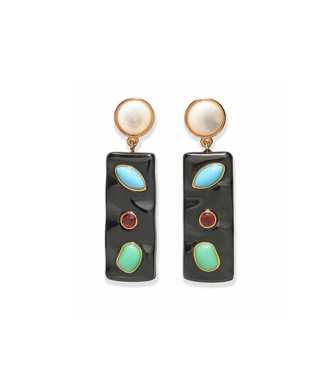 Taking cues from the intricate beauty of Spanish mosaics, we created these artful geometric column earrings with mother-of-pearl tops and hanging resin inlaid with garnet, chrysoprase and turquoise-colored stones.