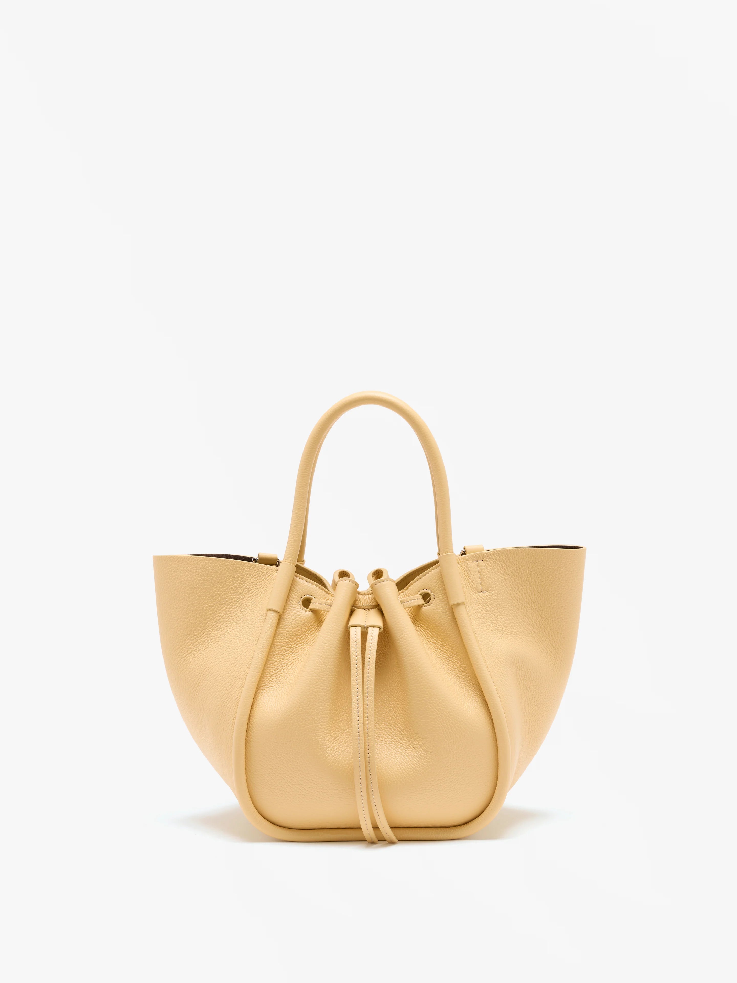 The Small Ruched Crossbody Tote is crafted to an unstructured, sculptural silhouette. Wide piping sweeps up to a ruched open top and two curved top handles.