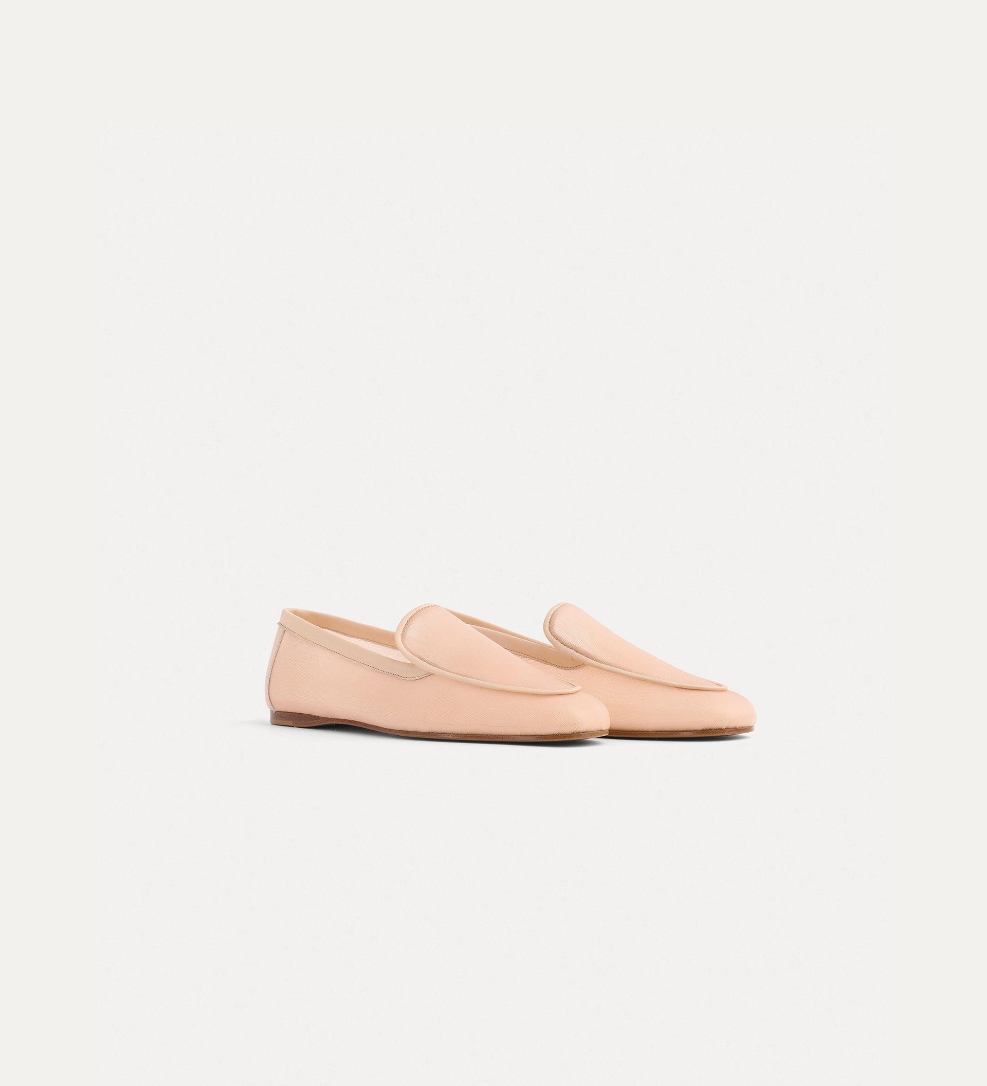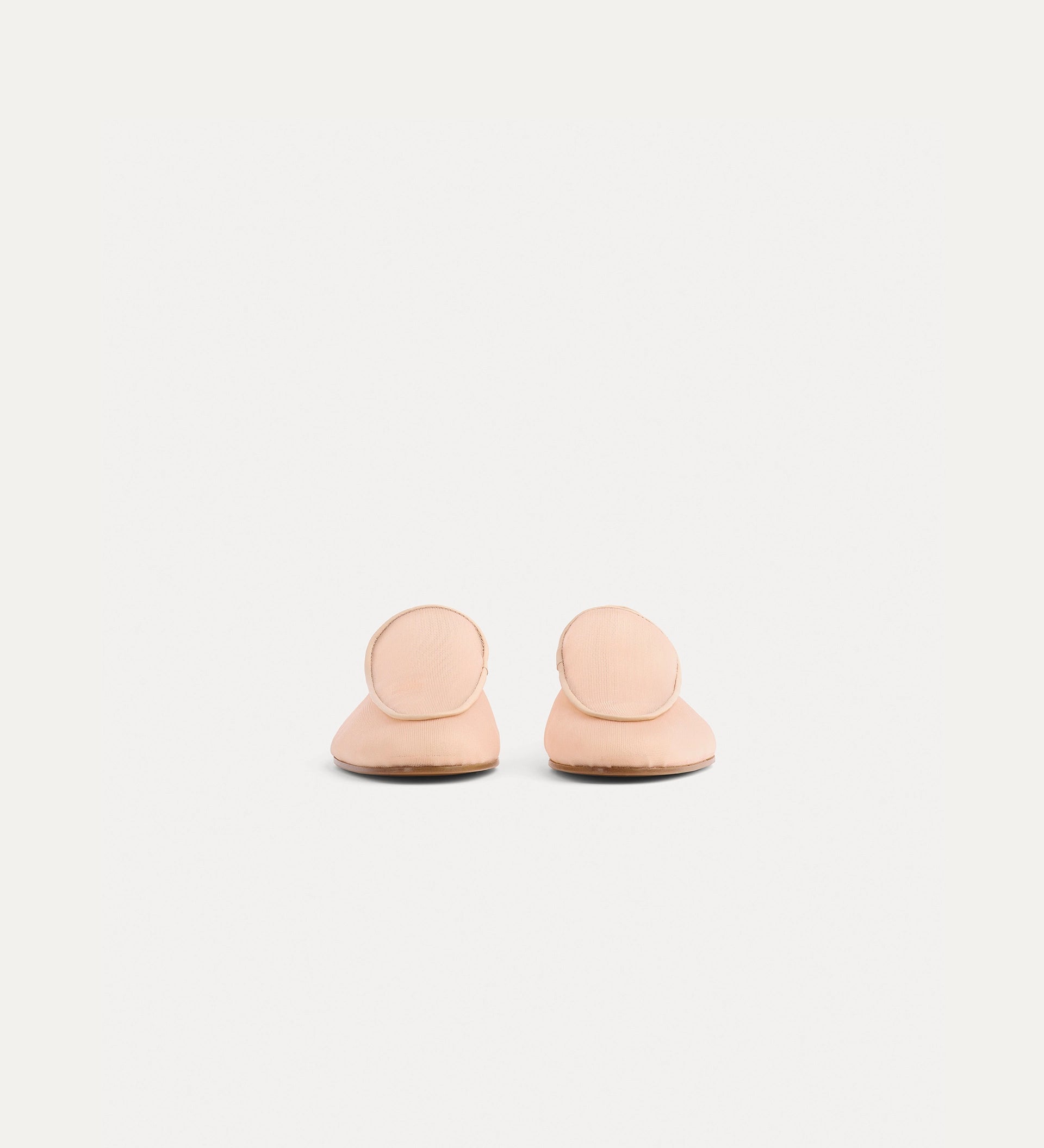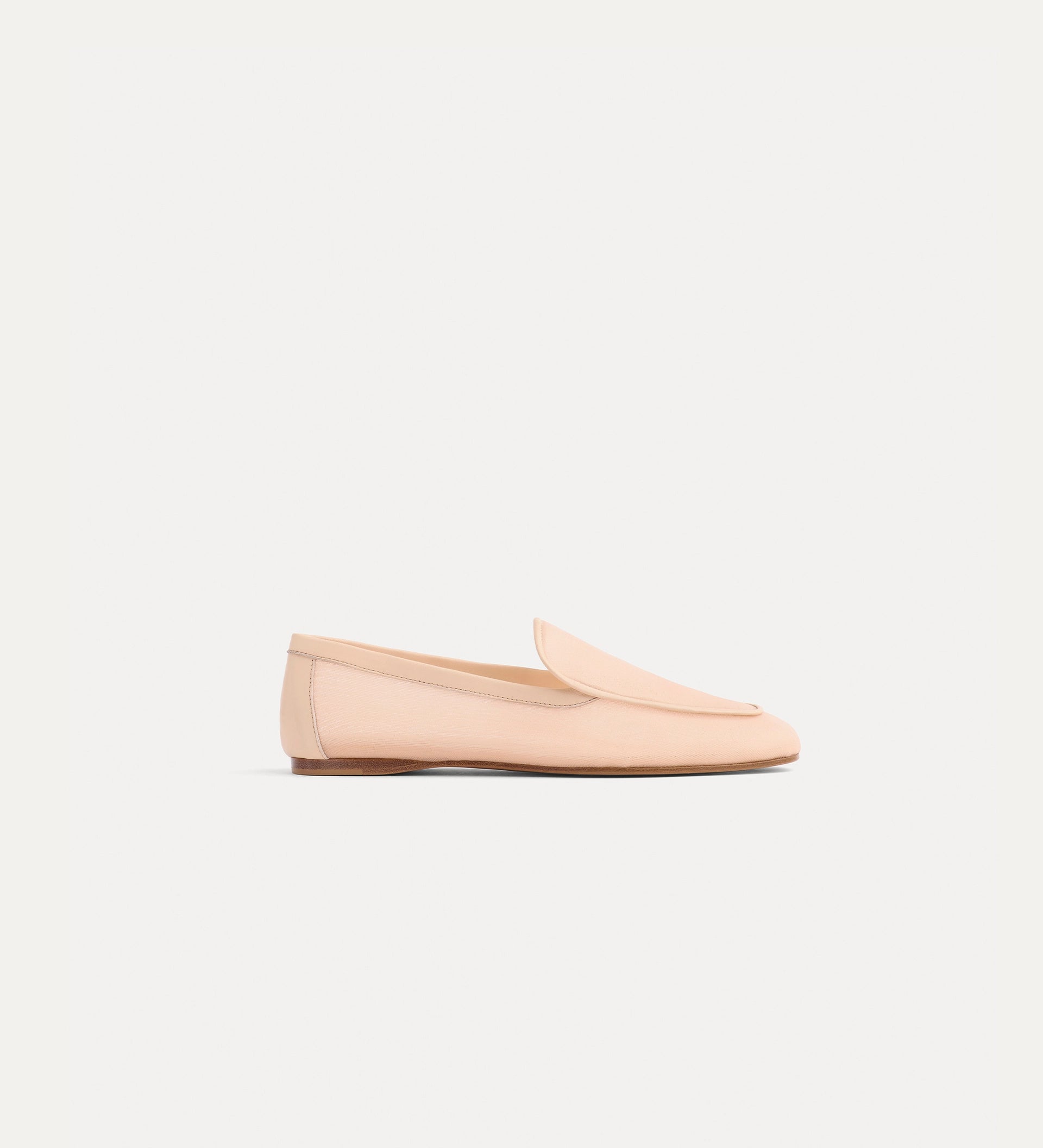The clean, metropolitan shape of the loafer is reinterpreted with a romantic touch through a durable tulle upper. tone—on—tone leather piping and details trace the neckline and apron, creating a poetic mix of simplicity and transparency.