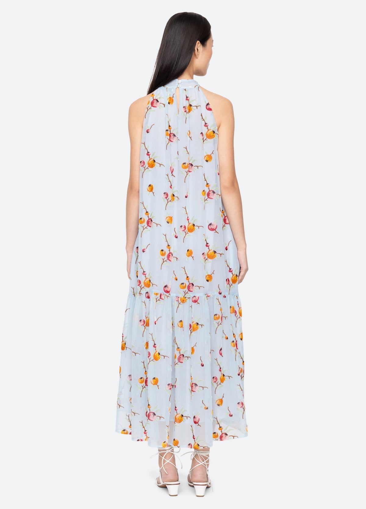 The Freya dress features a halter neckline accented with an oversized floral detail and is crafted from velvet burnout fabric with an all-over fruit pattern. Designed with a dropped waist and midi silhouette, it drapes beautifully for effortless movement and a flattering, easygoing shape.