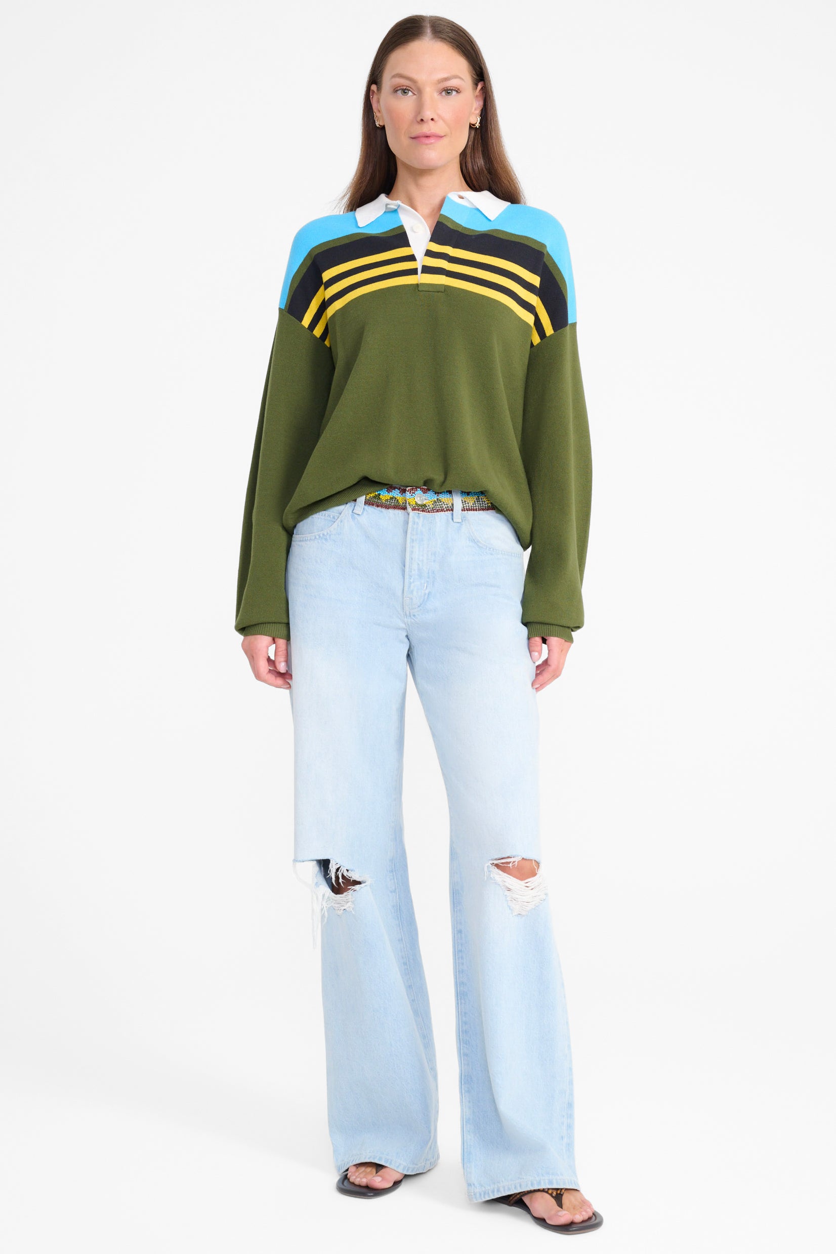 A cotton polo knit with a contrast white collar and bold color-blocked stripes. The relaxed fit makes it perfect for effortless everyday styling—dress it up or down depending on your mood.
