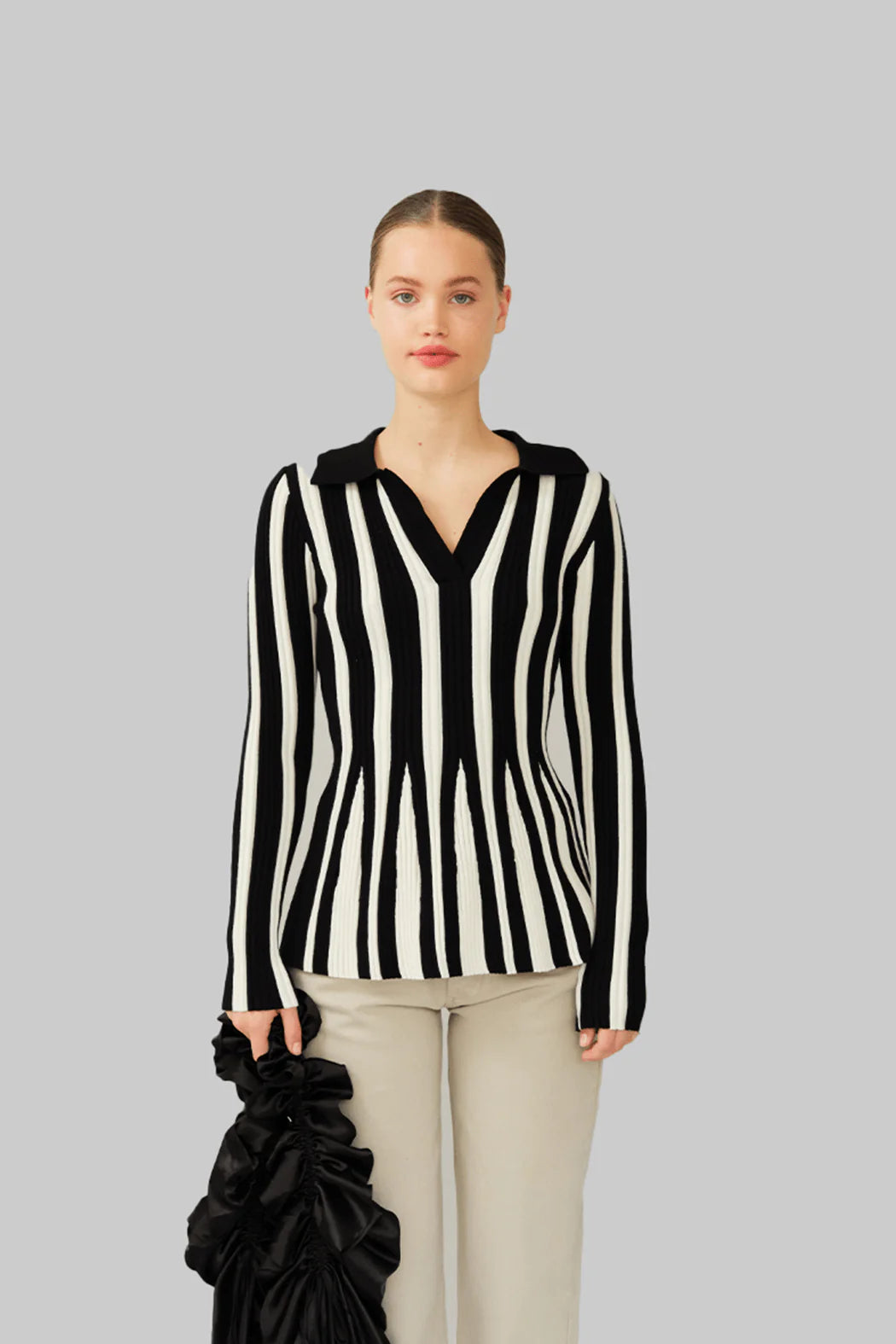 The Cara Sweater is crafted from a soft blend of 95% organic cotton and 5% cashmere in black with contrasting white stripes. Designed with a pointed collar and a subtle V-neckline, it has a body-following silhouette enhanced by structured rib knit for a refined finish.