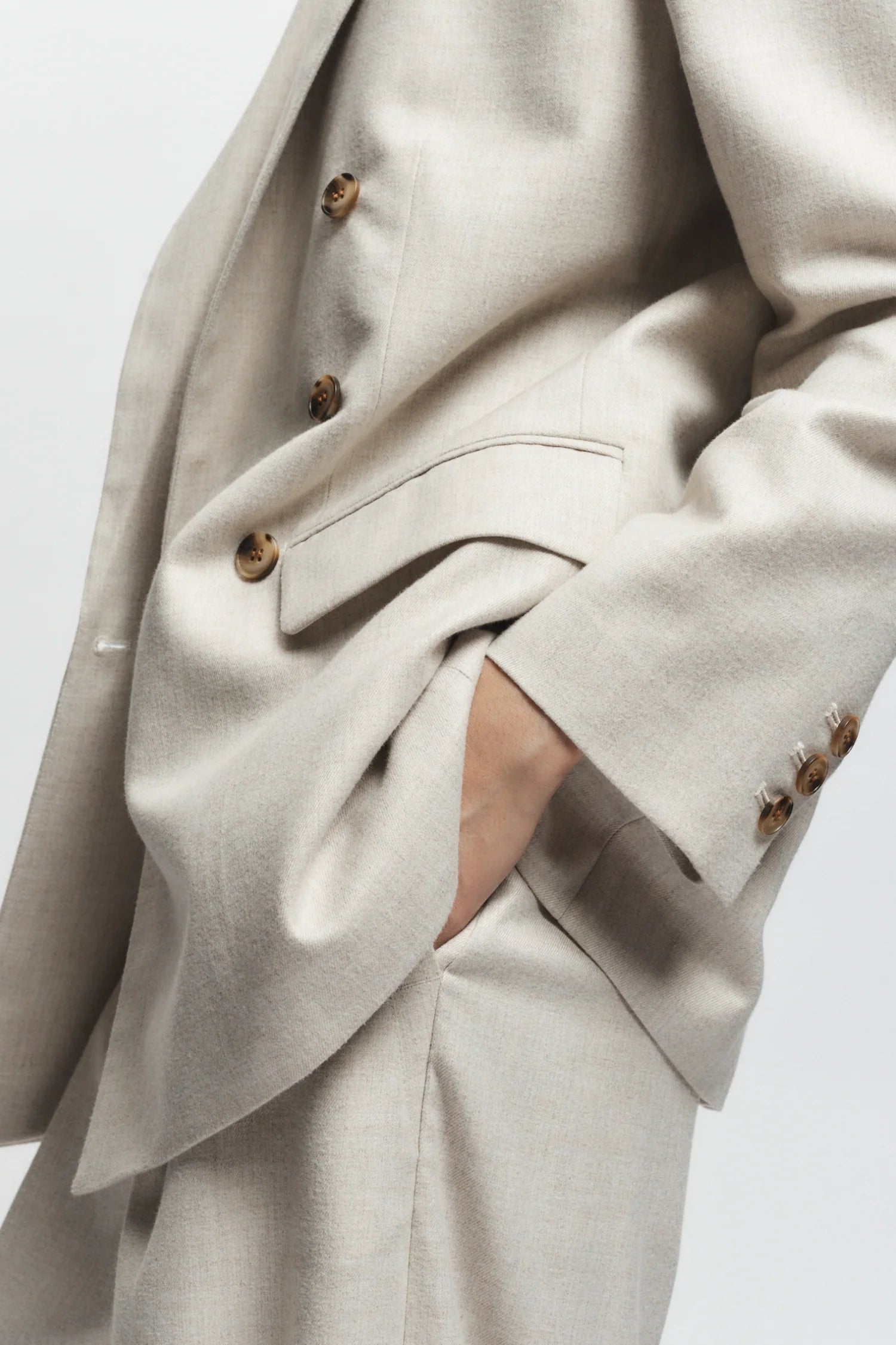 The Sullivan Double-Breasted Blazer in oatmeal features a longline cut and a relaxed fit throughout the body, offering a sophisticated yet comfortable silhouette. Its versatile design allows you to dress it up or down for any occasion.