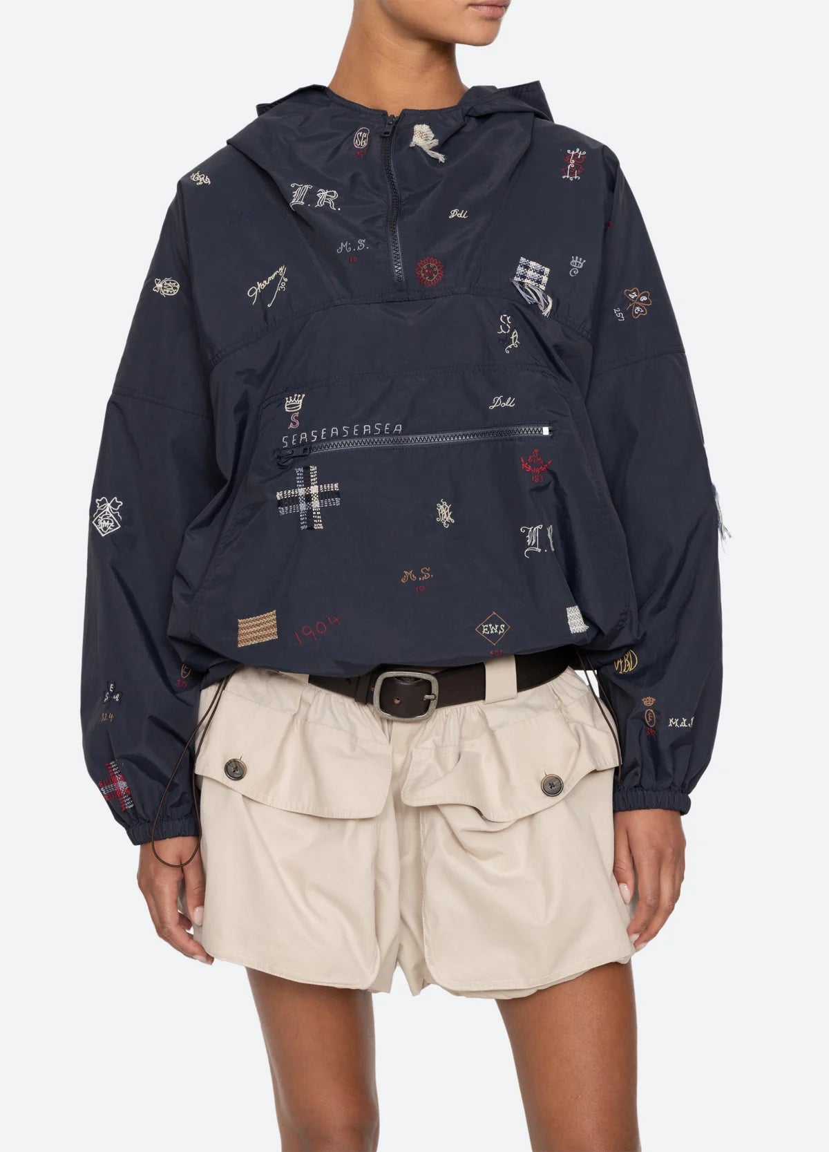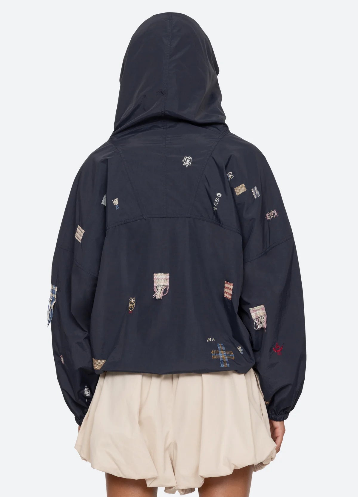 The Claira embroidered windbreaker is detailed with intricate embroidery and hand-mended stitching throughout. Designed with a quarter-zip, oversized front pocket, adjustable drawstring hem, and hood, it blends artisanal craftsmanship with practical, elevated everyday style.