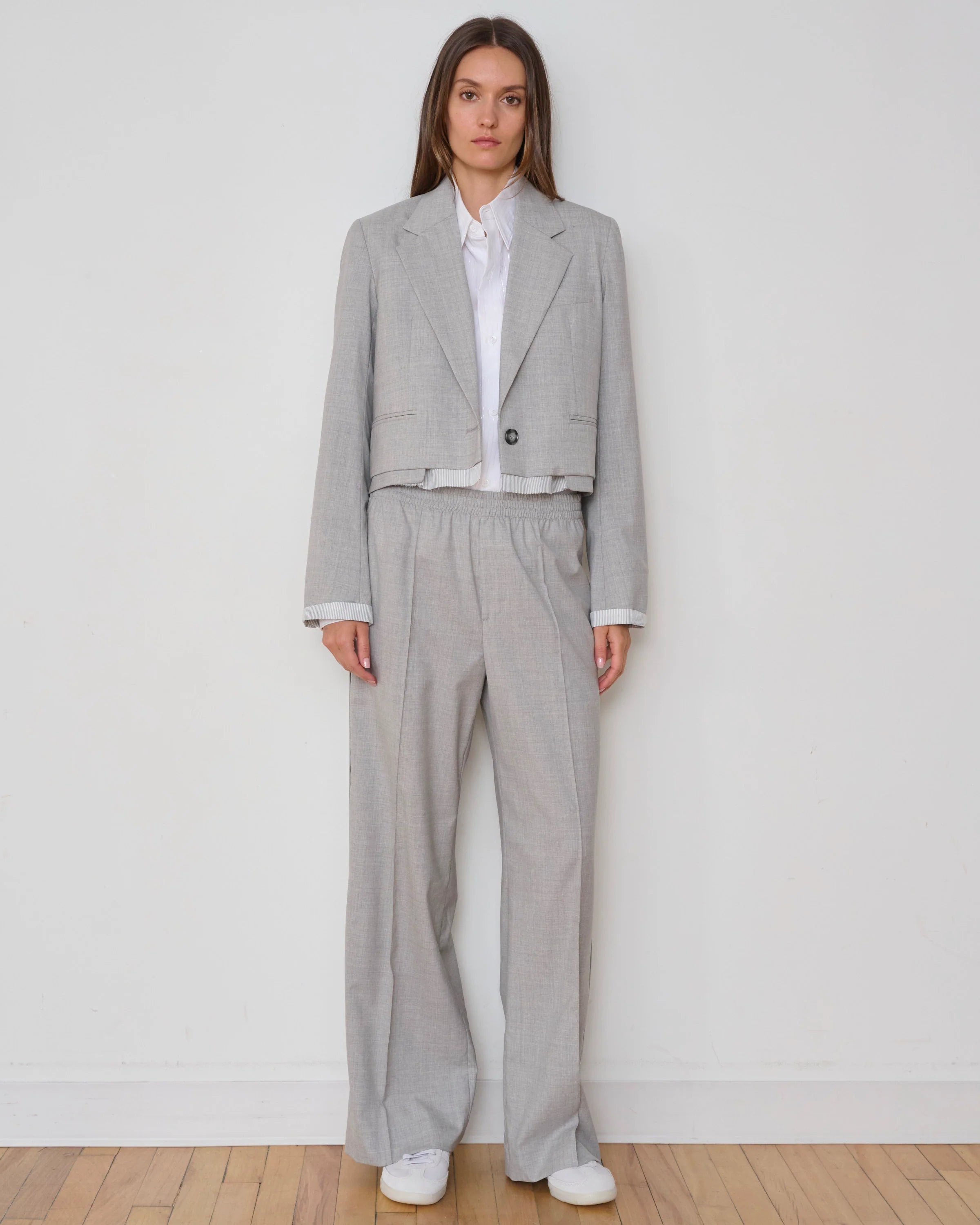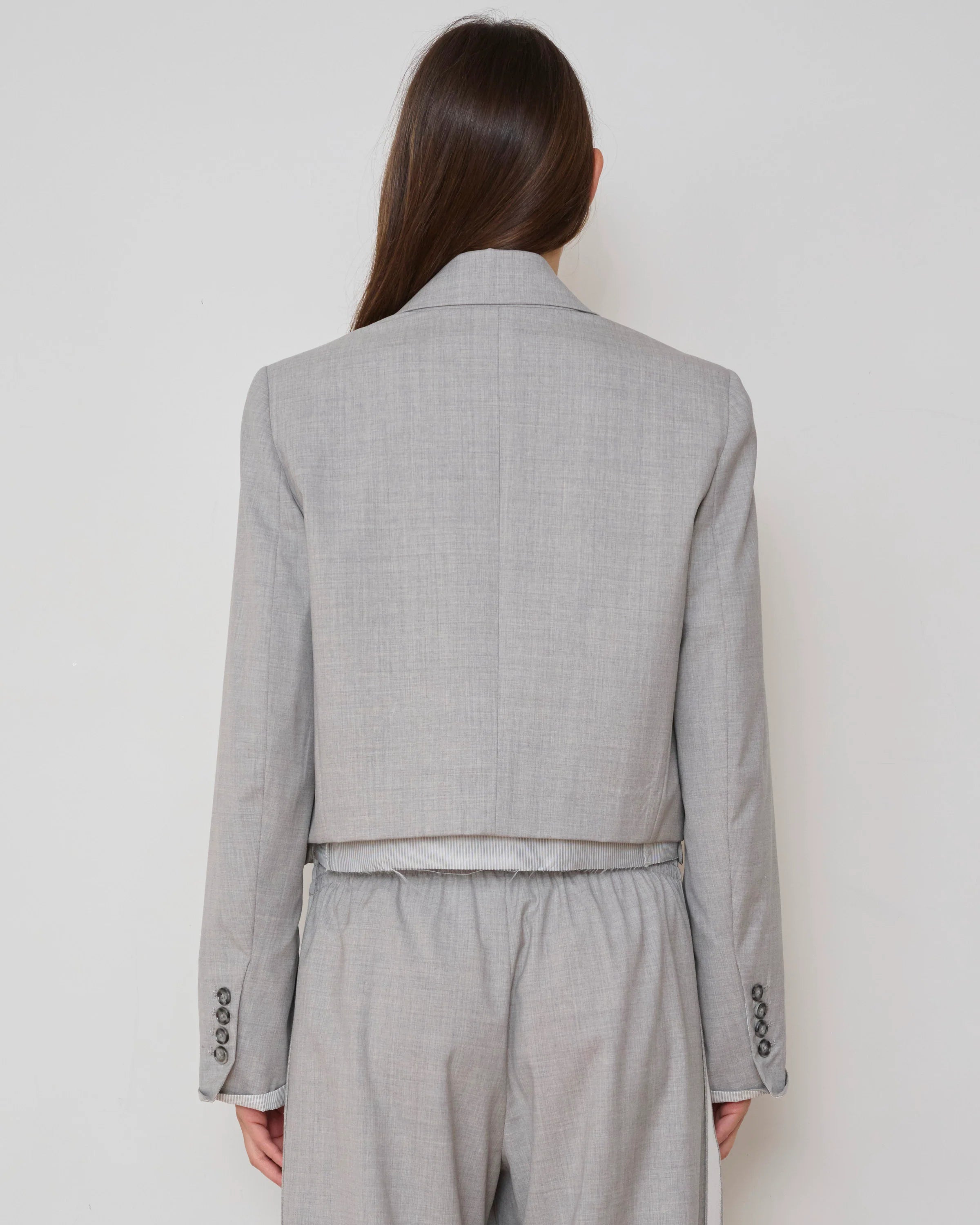 The Cocktail Blazer is a study in refined contrasts. Crafted from luxurious wool, its tailored, cropped fit redefines the classic silhouette with a clean, modern aesthetic. The unexpected touch of raw-edge lining at the hem adds a subtle note of effortless sophistication, making this piece an essential for any curated wardrobe.
