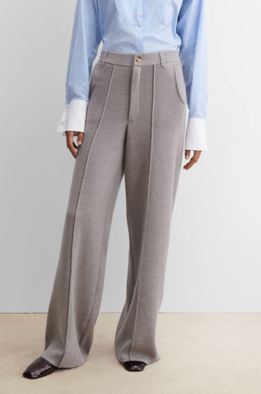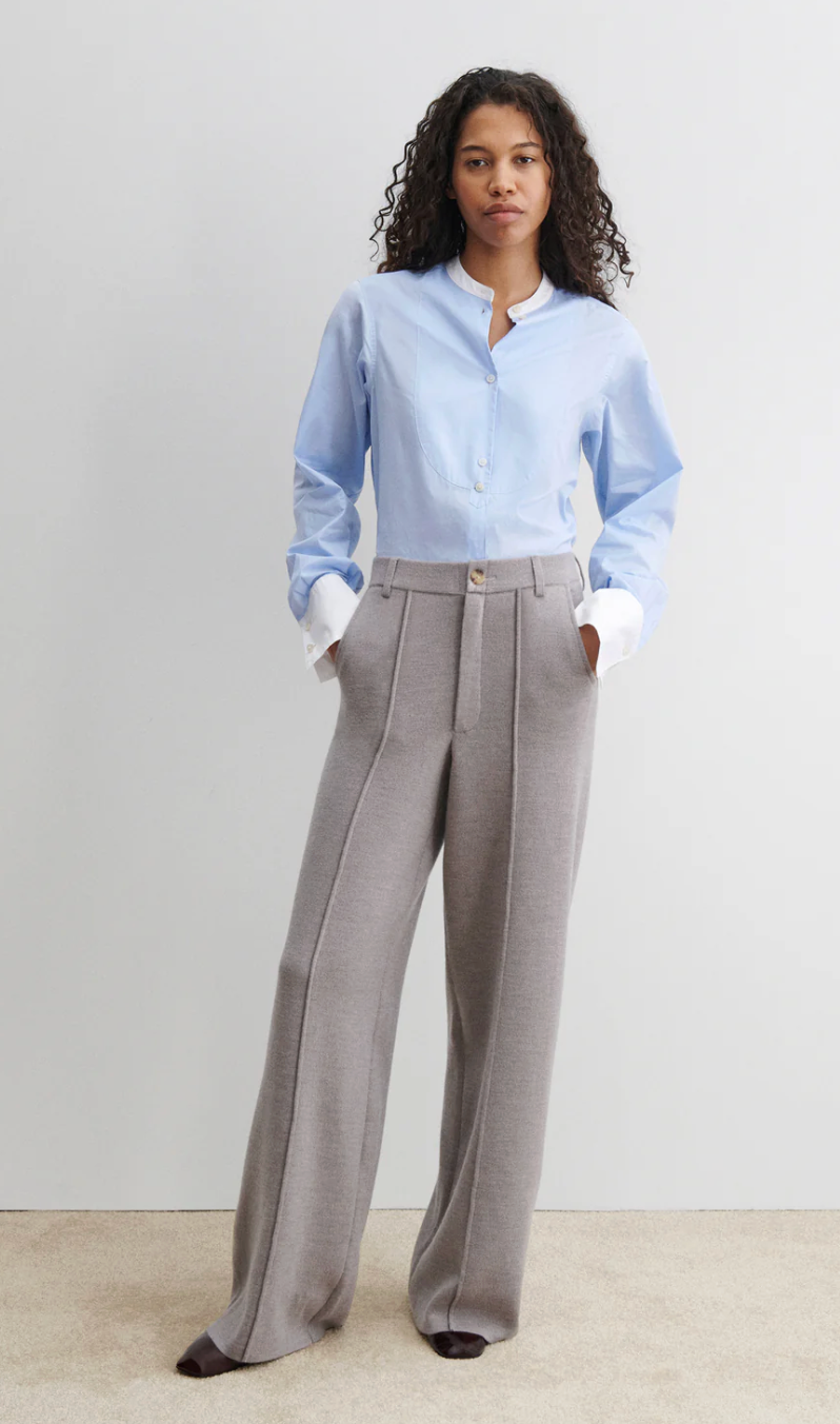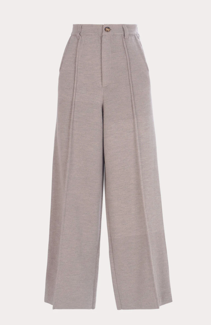 Wide-leg trousers cut from 100% wool in a doubleface construction. Boiled wool offers both structure and softness, while overwashing creates a felted finish. Each piece is softly tailored and ideal for the office, gallery, or any elevated everyday setting. Features stitched front seams and a high waist.