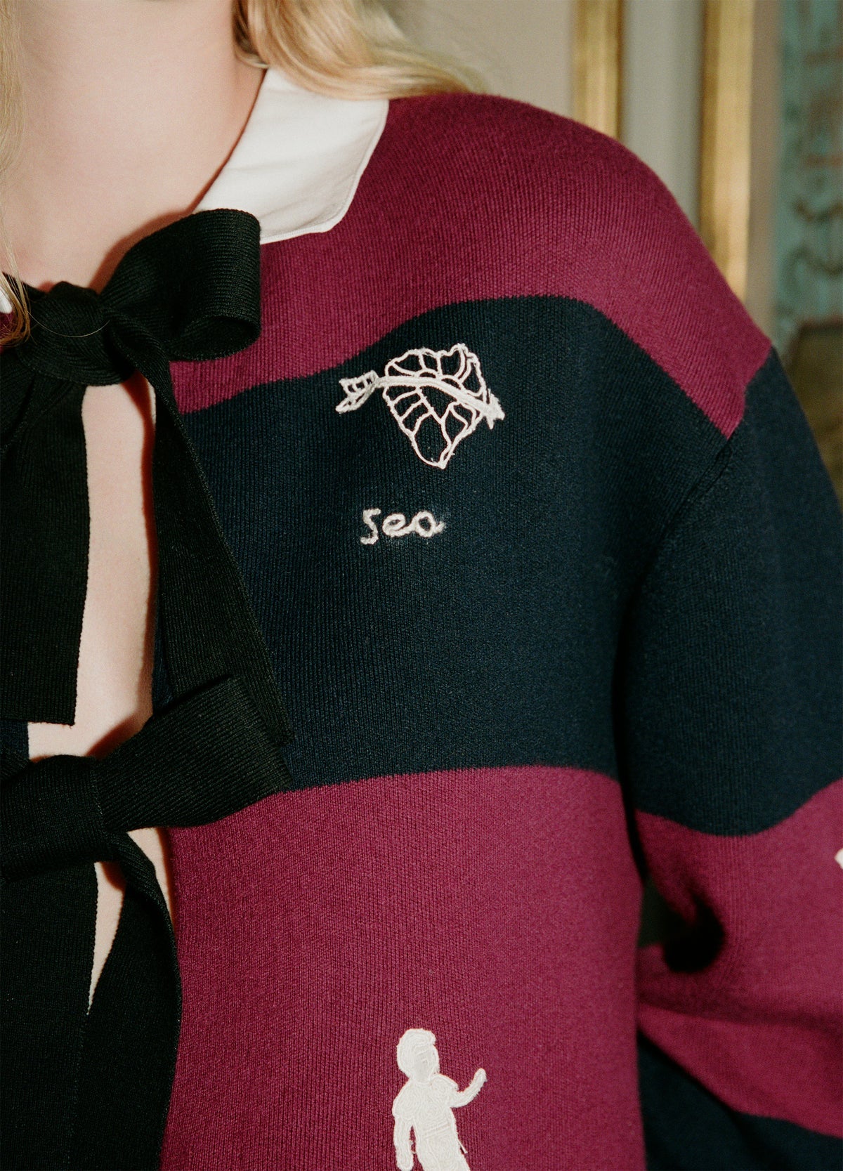 The Hester tie front cardigan is richly adorned with folkloric lace motifs throughout, blending artisanal craftsmanship with a subtle rugby-inspired edge. Self tie closures at the front add a delicate, feminine finish to this distinctive piece.