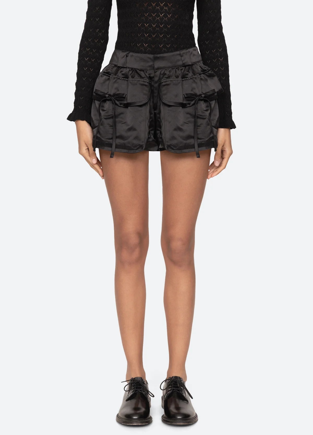 The Loraine satin bubble shorts are designed with oversized front pockets accented by feminine bow detailing. Finished with a softly rounded bubble hem, they bring a playful charm to polished tailoring.