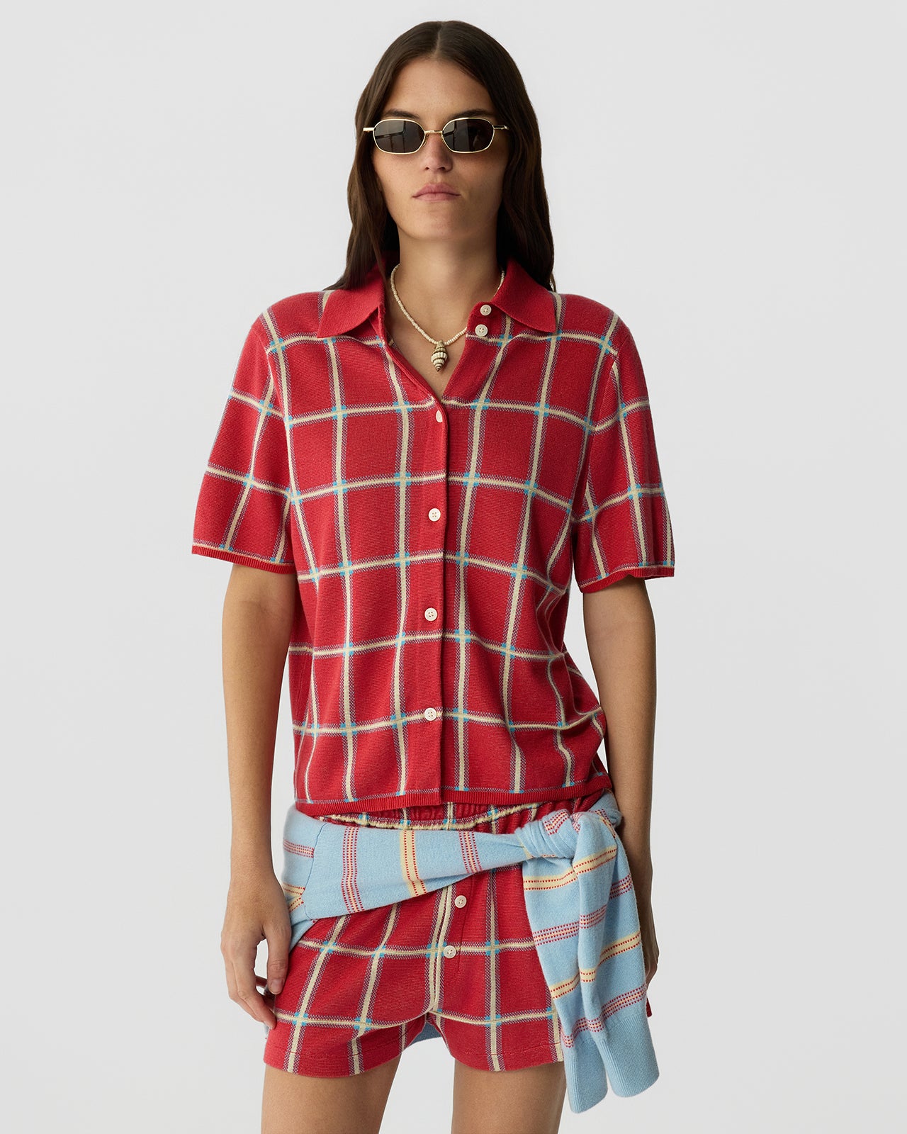 The Picnic Plaid Shirt is a fine-weight silk–linen plaid button-up crafted in a three-color jacquard stitch. Designed with a short sleeve and boxy fit, this lightweight summer plaid shirt delivers breathable structure with an easy feel.