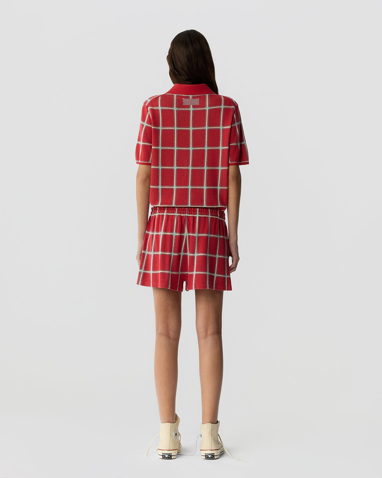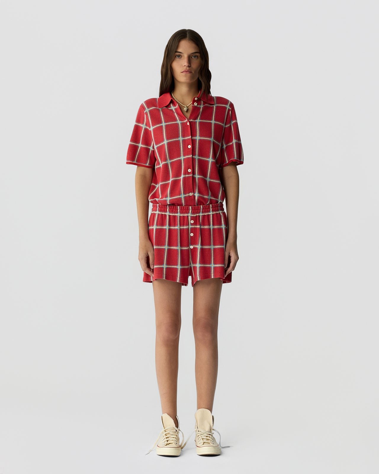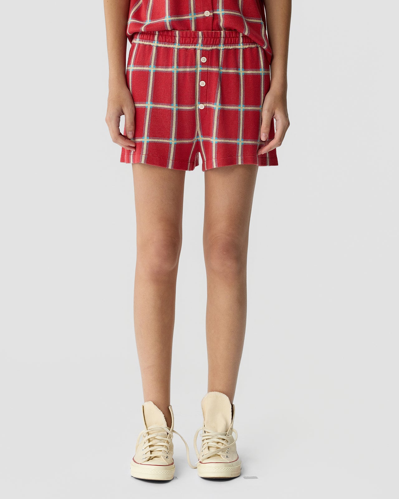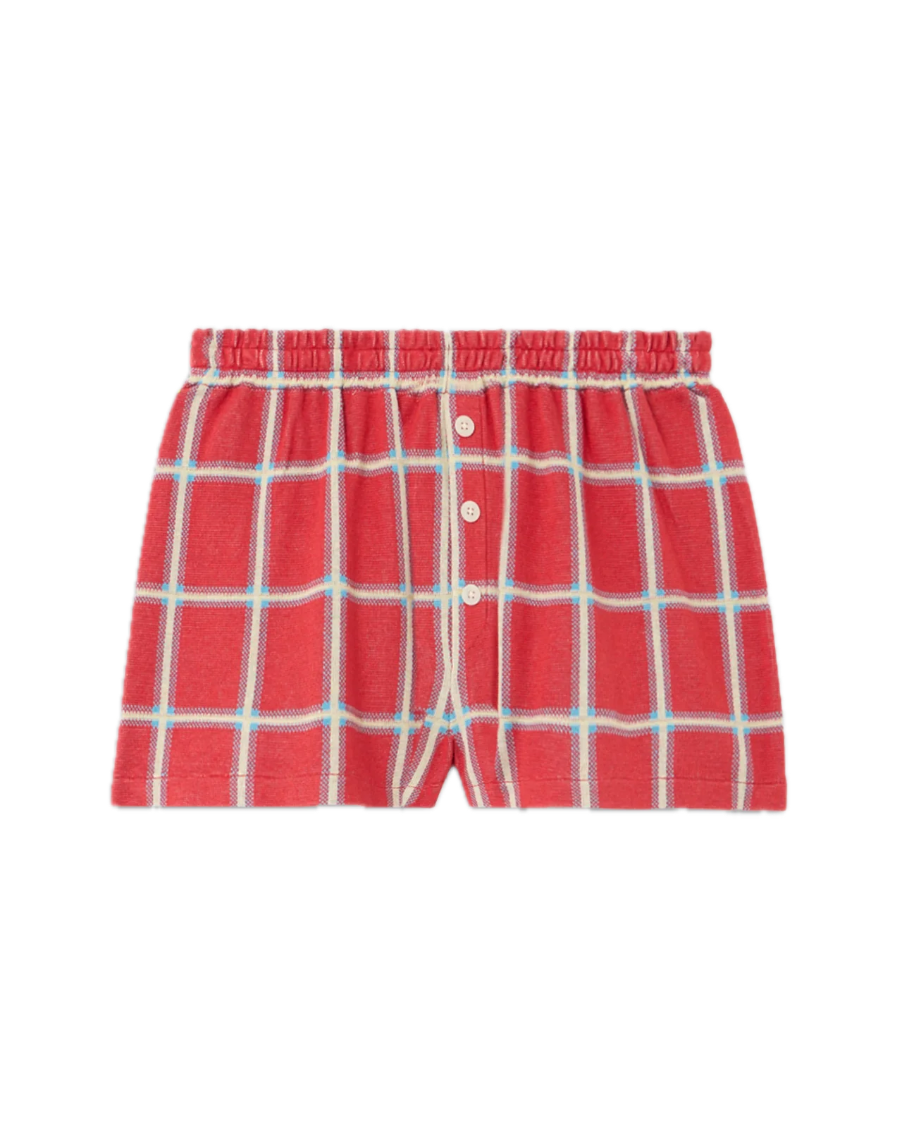 The Picnic Plaid Shorts are women’s lightweight silk–linen plaid boxer shorts with a relaxed pull-on fit and tailored button accents. Soft, breathable, and slightly nostalgic, these summer plaid shorts channel effortless off-duty style.