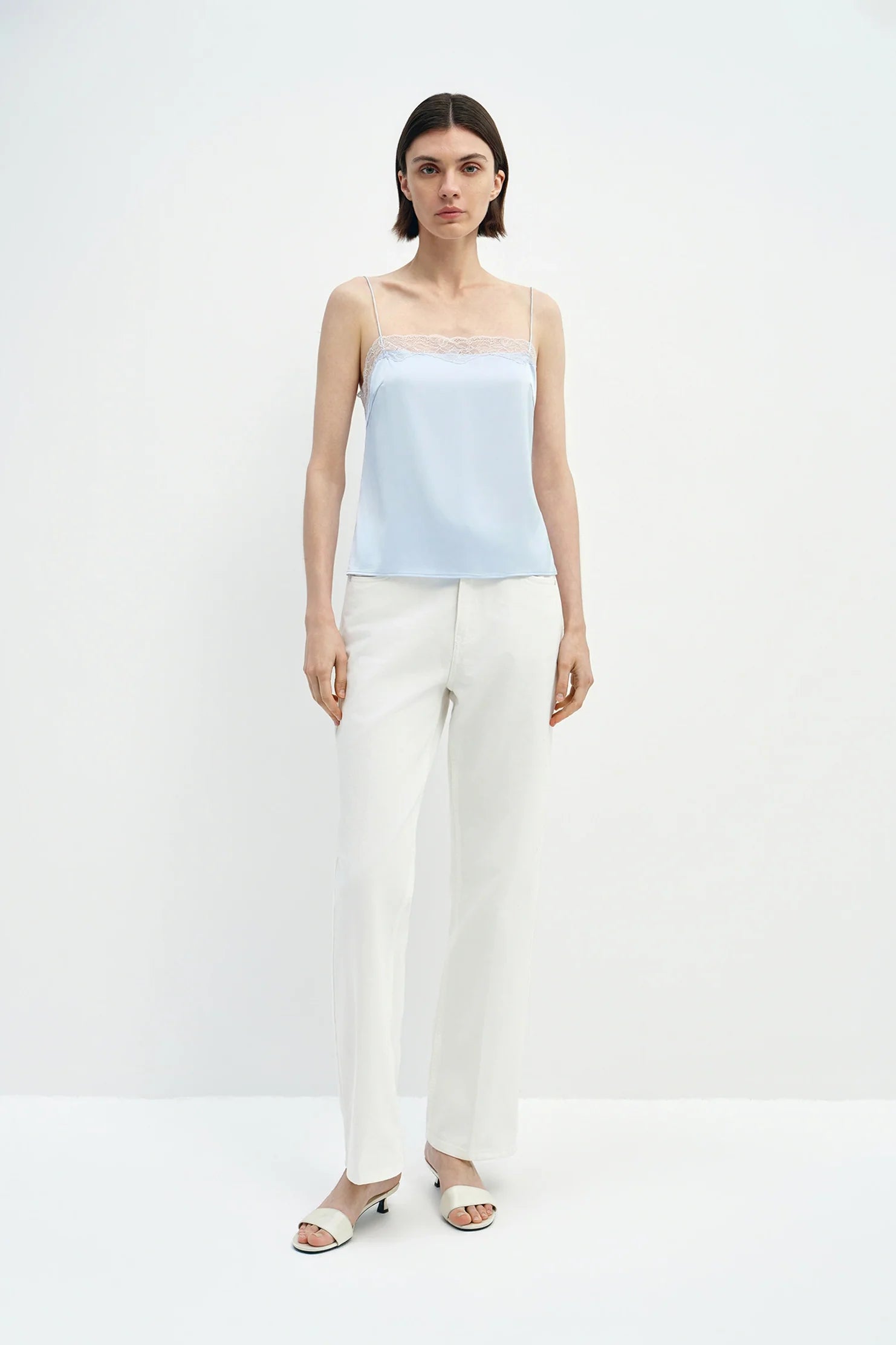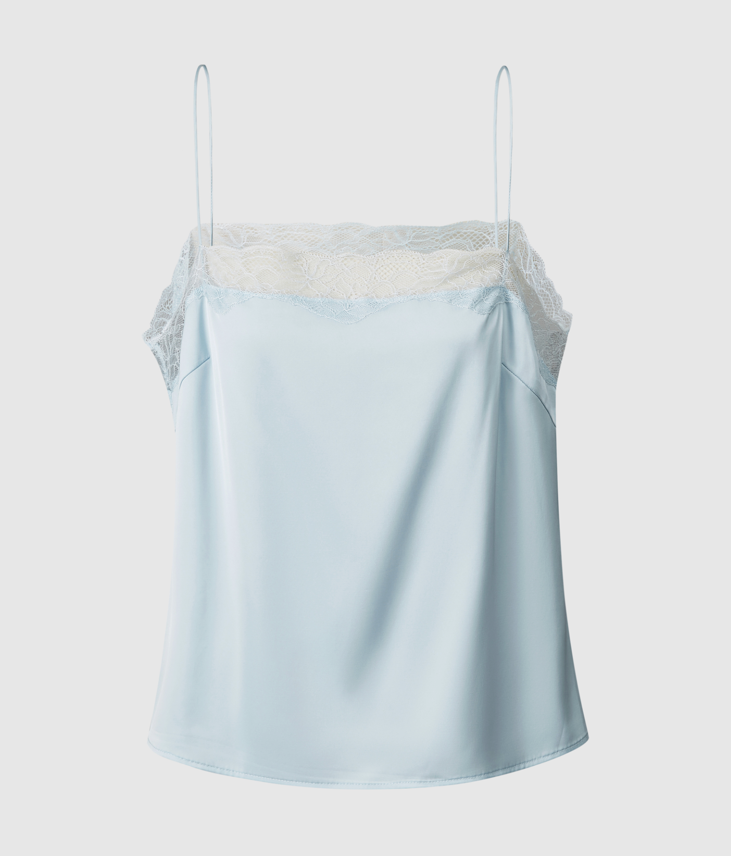 A satin cami top finished with delicate lace trim, balancing lingerie-inspired detailing with a clean, modern silhouette.