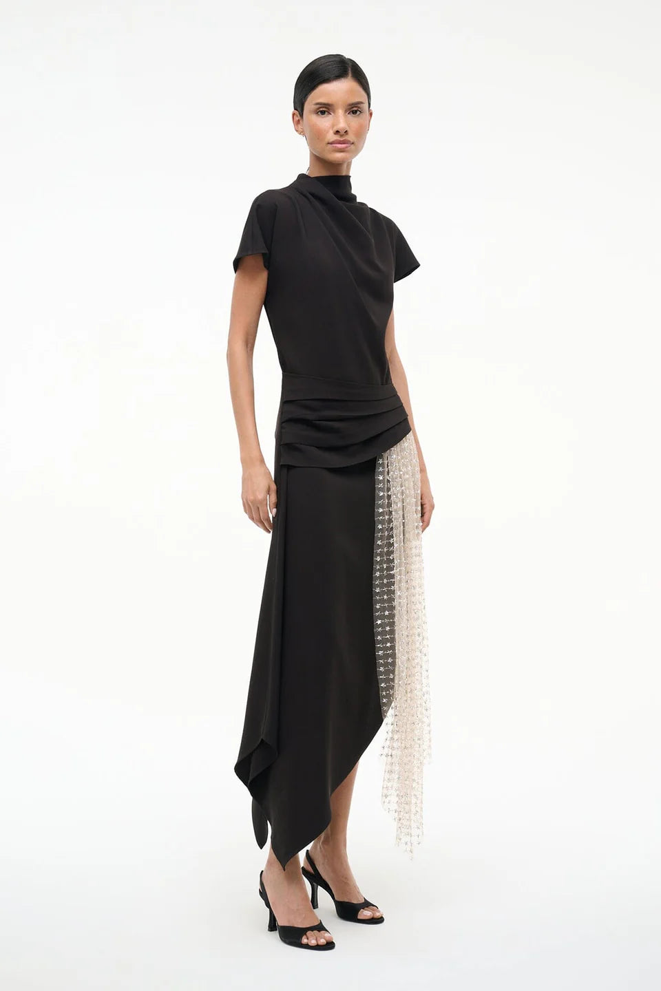 The Effie dress features a high, softly draped neckline and short sleeves. The bodice and skirt are gathered at the hip with a metallic enhanced tulle fabric with subtle draping and an asymmetrical hem.
