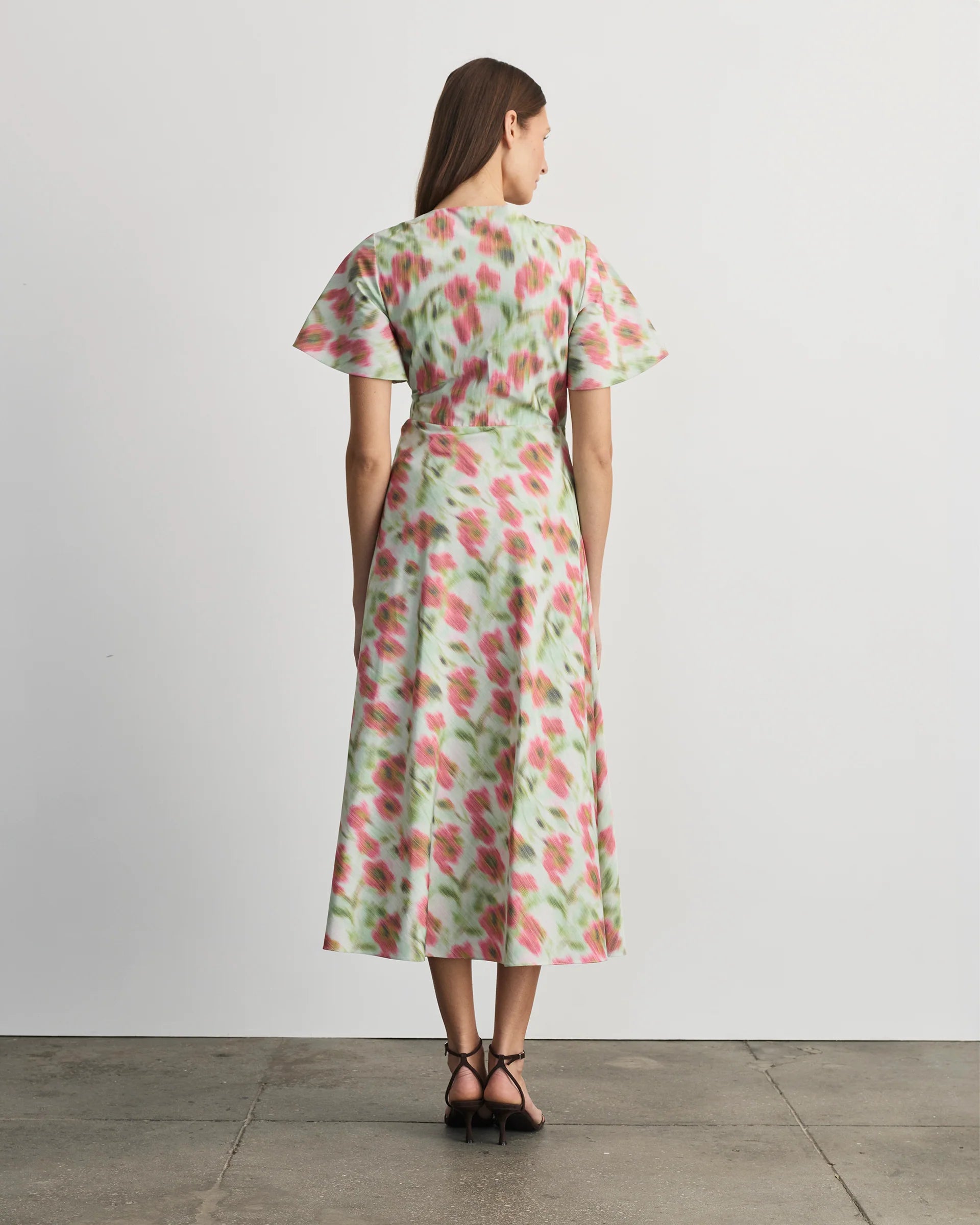 Designed in a floral printed taffeta, the Klaire Dress is our go-to wrap dress this spring season. Featuring a bias-cut skirt that flows effortlessly, flutter sleeves, and a self-tie belt, the Klaire Dress is an elevated wrap dress ready for any garden party. Pair the Klaire Dress with strappy kitten heels for an event ready look.
