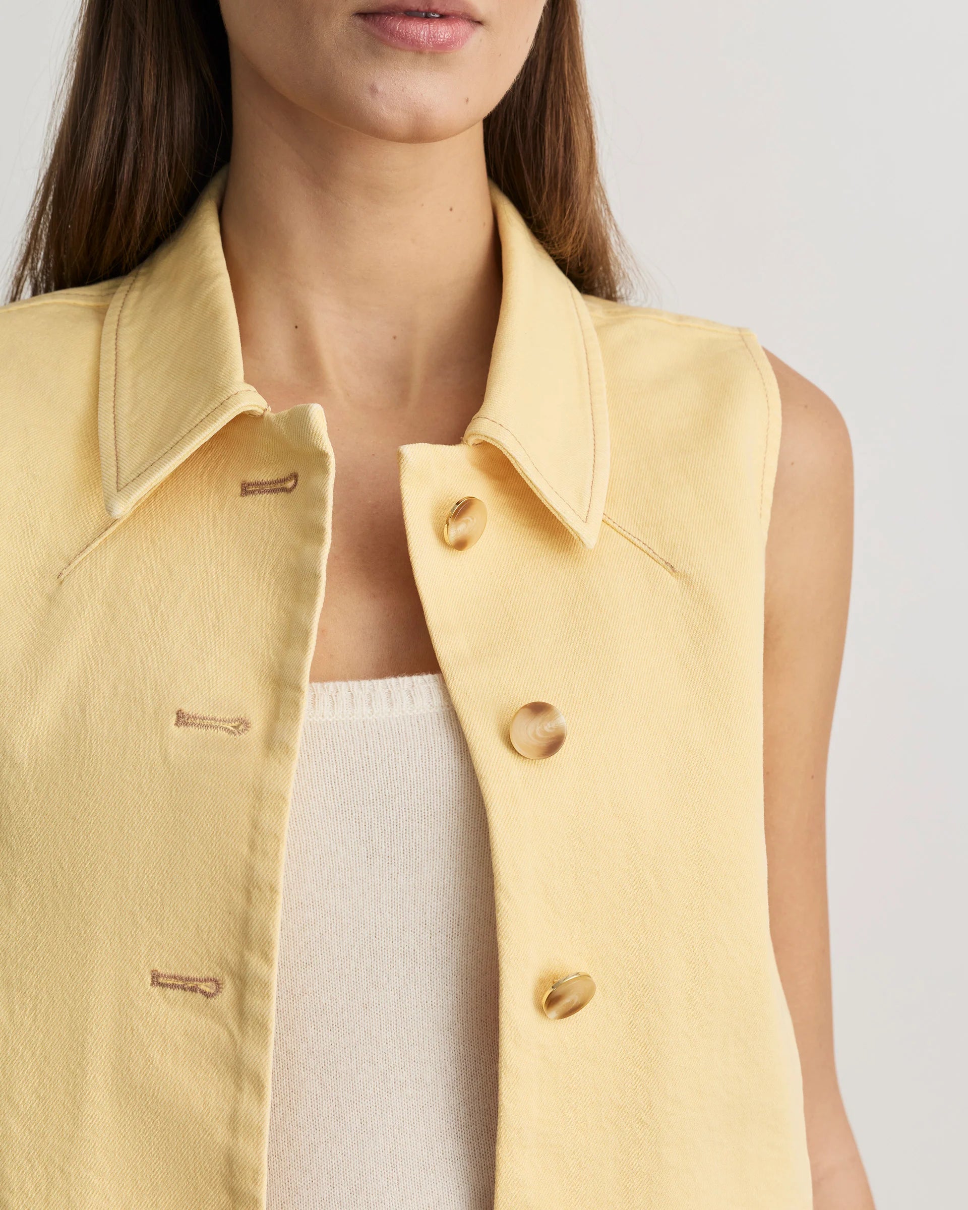 Designed in a crisp butter colored denim, the Parton Top is an elevated staple with fresh detailing and just the right amount of attitude. Featuring a collared neckline, tortoiseshell buttons, and a cropped fit, Parton is as chic as it is easy.