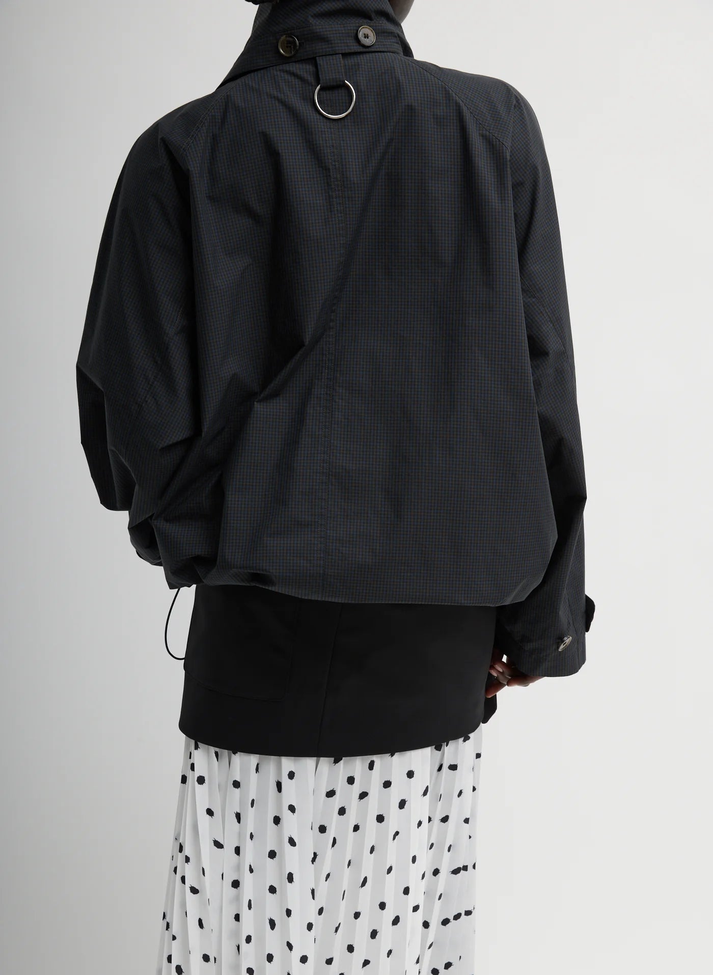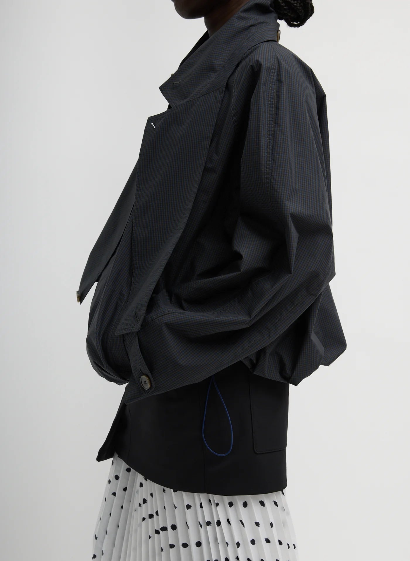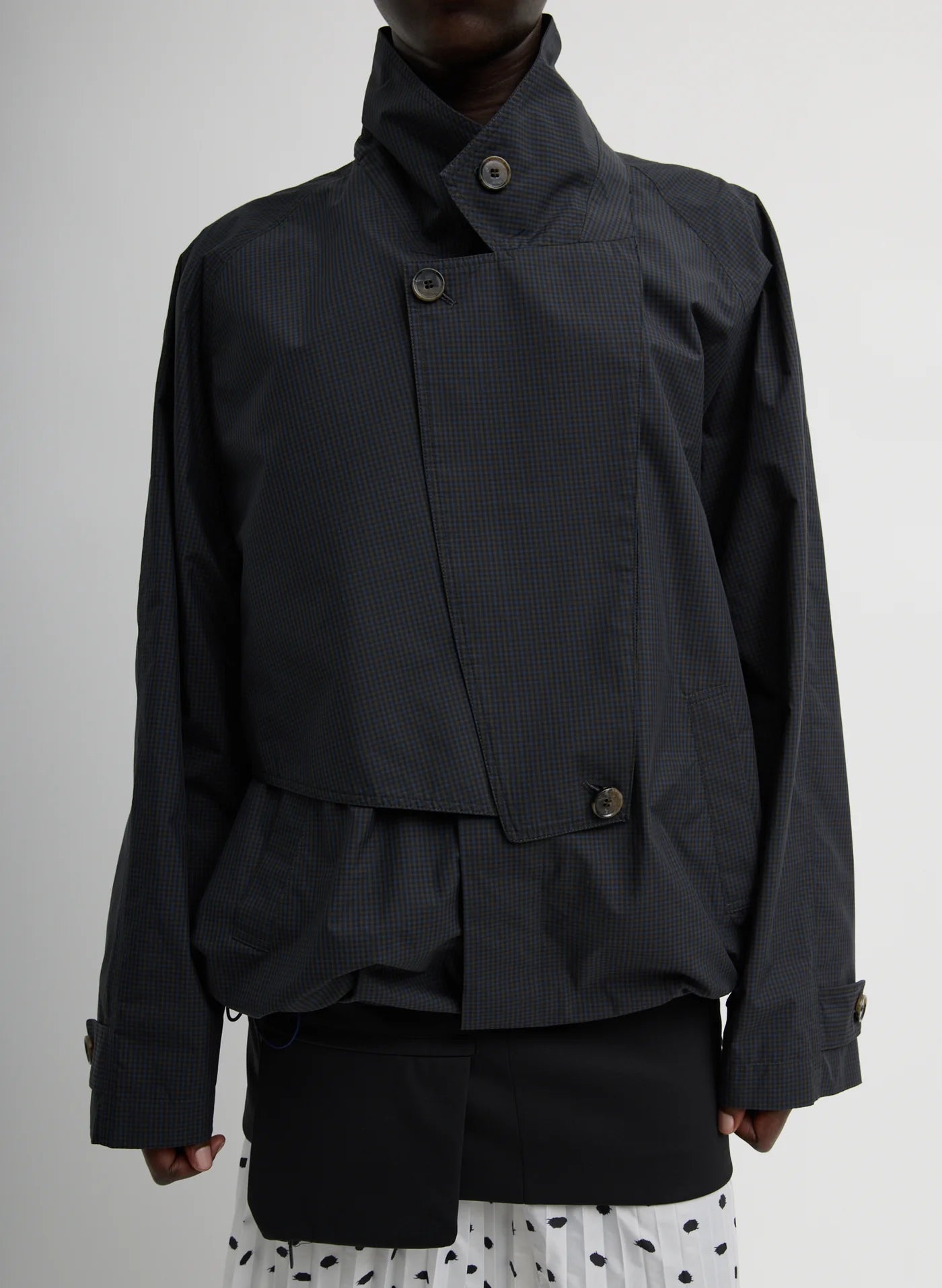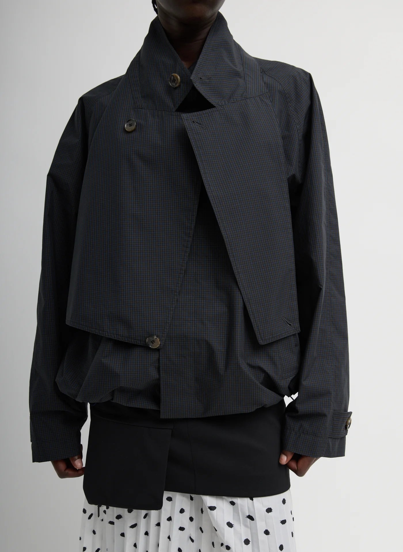 The Charles Menswear Trench Anorak blends traditional tailoring with modern functionality. Designed with an adjustable elastic waistband and convertible lapel flaps, this piece offers multiple styling options to suit your mood and proportion play. Crafted from a structured yet fluid fabric that drapes effortlessly, it delivers the perfect balance of polish and ease.