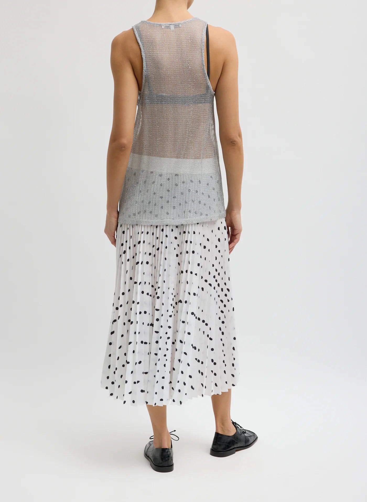 Combining ease with elegance, the Scribble Dot Print Pull-On Pleated Skirt features a custom Tibi digital print on a recycled fabrication with a fluid silhouette and subtle pleating. Designed with an adjustable waistband for personalized styling, this skirt invites a CMC approach to dressing—balancing creativity, modernity, and classicism.