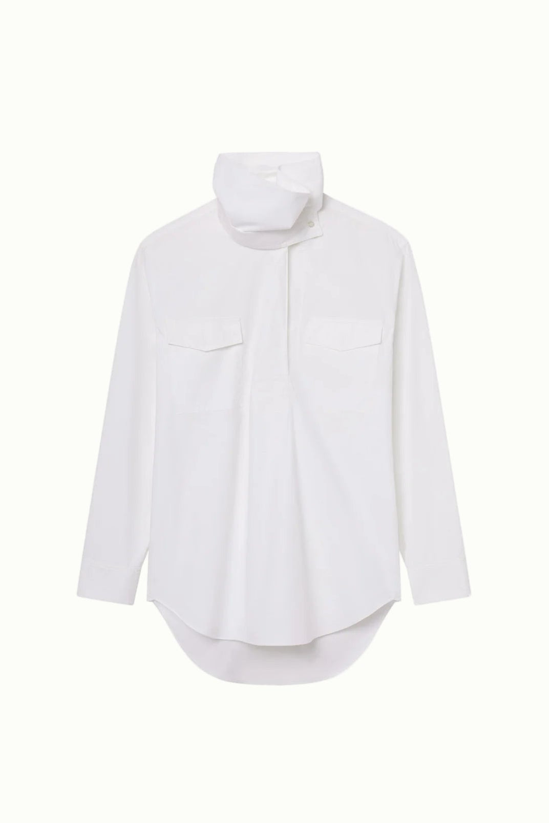 Crafted from soft pima stretch poplin, this style reimagines the cotton shirt with a utilitarian twist. An adjustable buttoned funnel neck, flap pockets, and a subtle high-low hem.