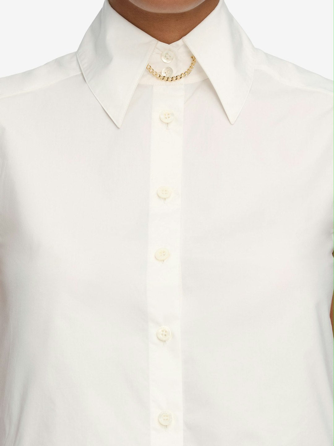 This cotton poplin shell is a modern take on a classic, set apart by a removable gold chain at the neckline for a subtle, vintage-inspired accent. It has a shirttail hem, back pleating and an elongated collar.