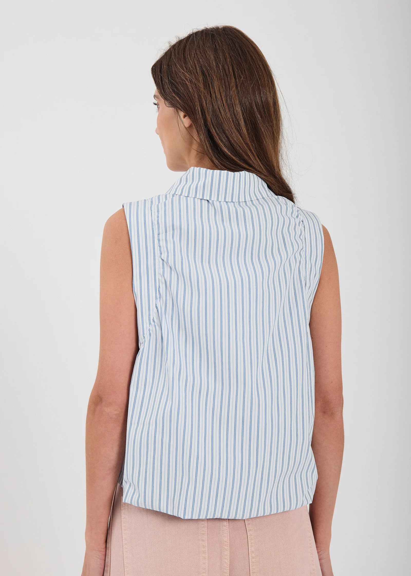 This sleeveless shirt is designed in a crisp cotton with vertical blue stripes for a timeless summer look. It features a classic collar, button-down front, and a slightly boxy fit that makes it easy to style with both tailored pieces and casual separates. Lightweight and breathable, it’s the perfect top for effortless warm-weather dressing.