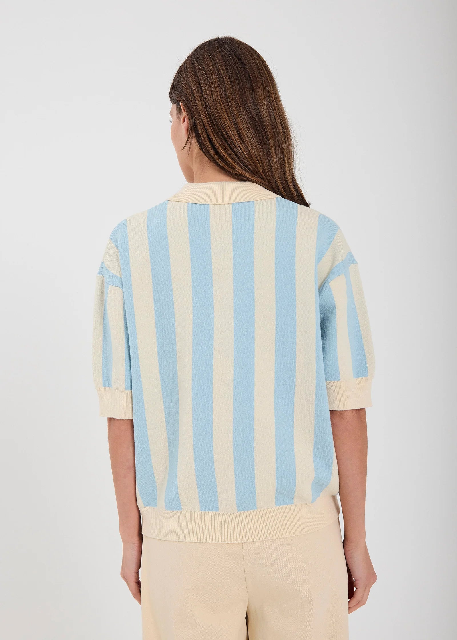 A playful knit polo with bold vertical stripes for a fresh, sporty look. Designed with a classic collar, button placket, and short sleeves. Perfect for effortless everyday styling.