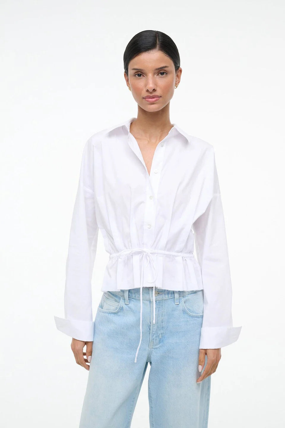 A classic white poplin button-down with unexpected details. The Primrose Shirt is crafted from a stretch poplin fabric whic keeps its crisp shape while a waisted drawstring and front tie add dimension to the classic silhouette.