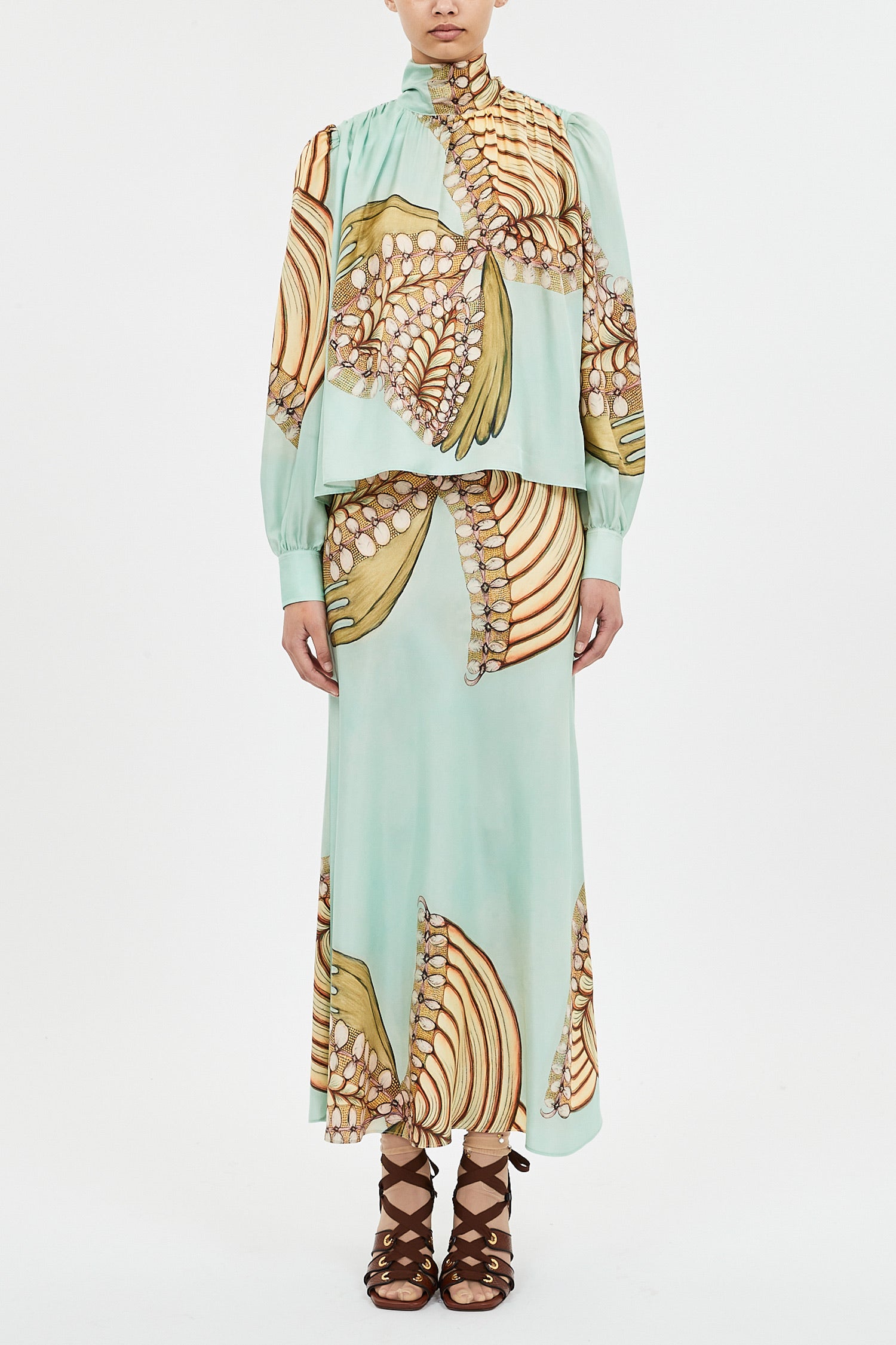 This Ornament blouse is crafted of silk and features a tie neck printed design.