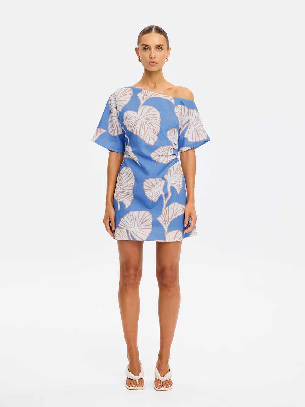 Ilana is oversized ivory and blush leaf motifs on a bold sky-blue base. The Ilana Off Shoulder Mini Dress features a flattering asymmetrical neckline, a subtle A-line skirt and tuck detailing at the waist, finished with an invisible side zip. Perfect for long lunches, daytime celebrations or summer evenings by the water.