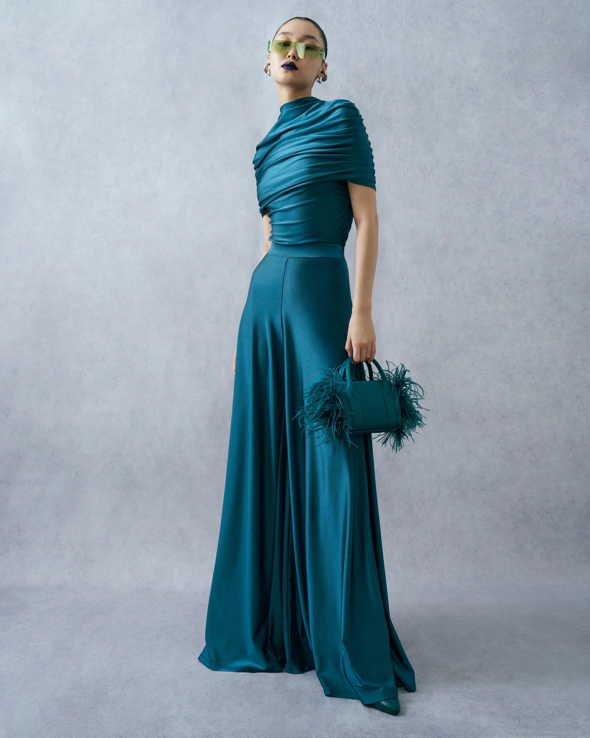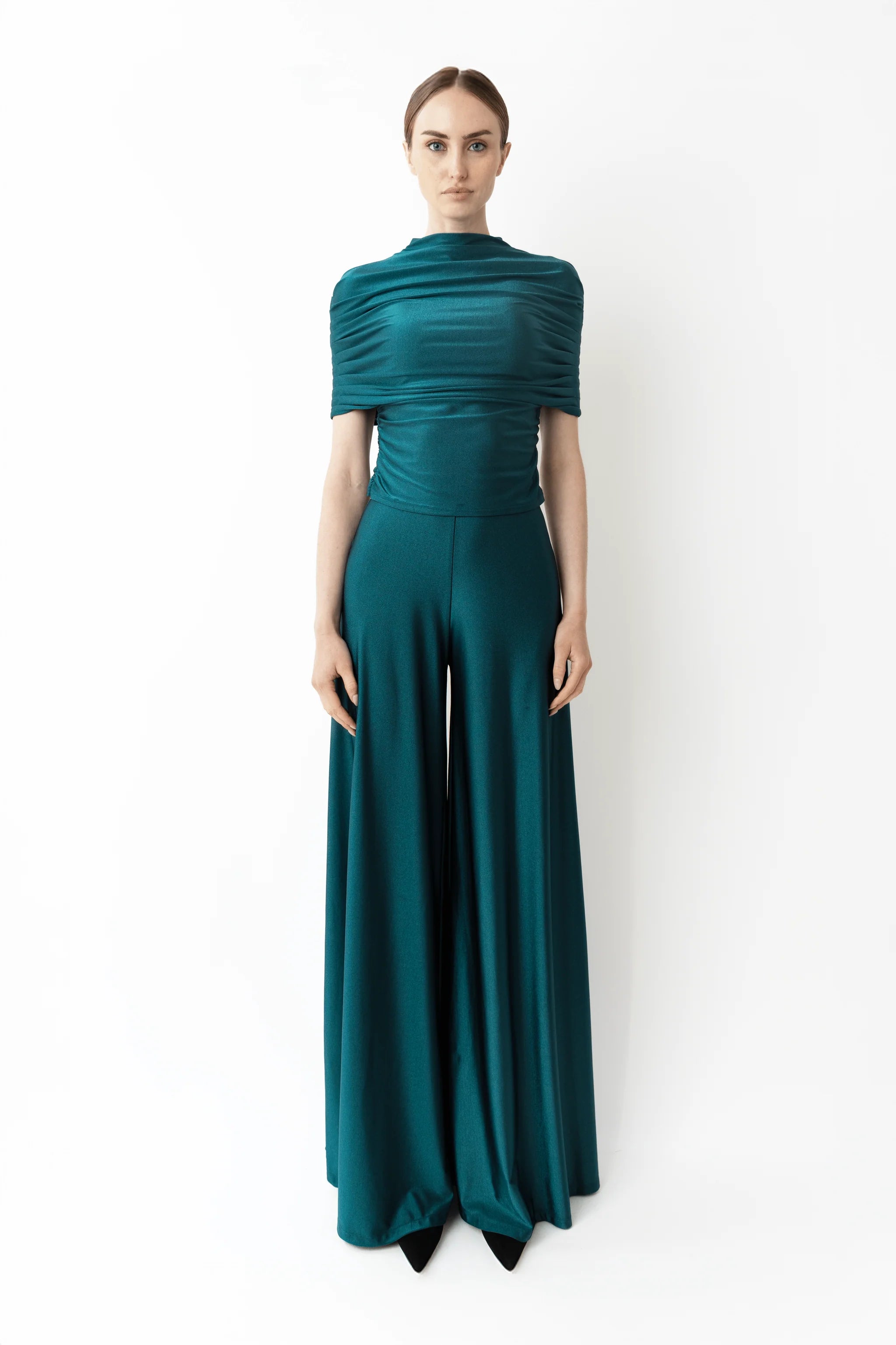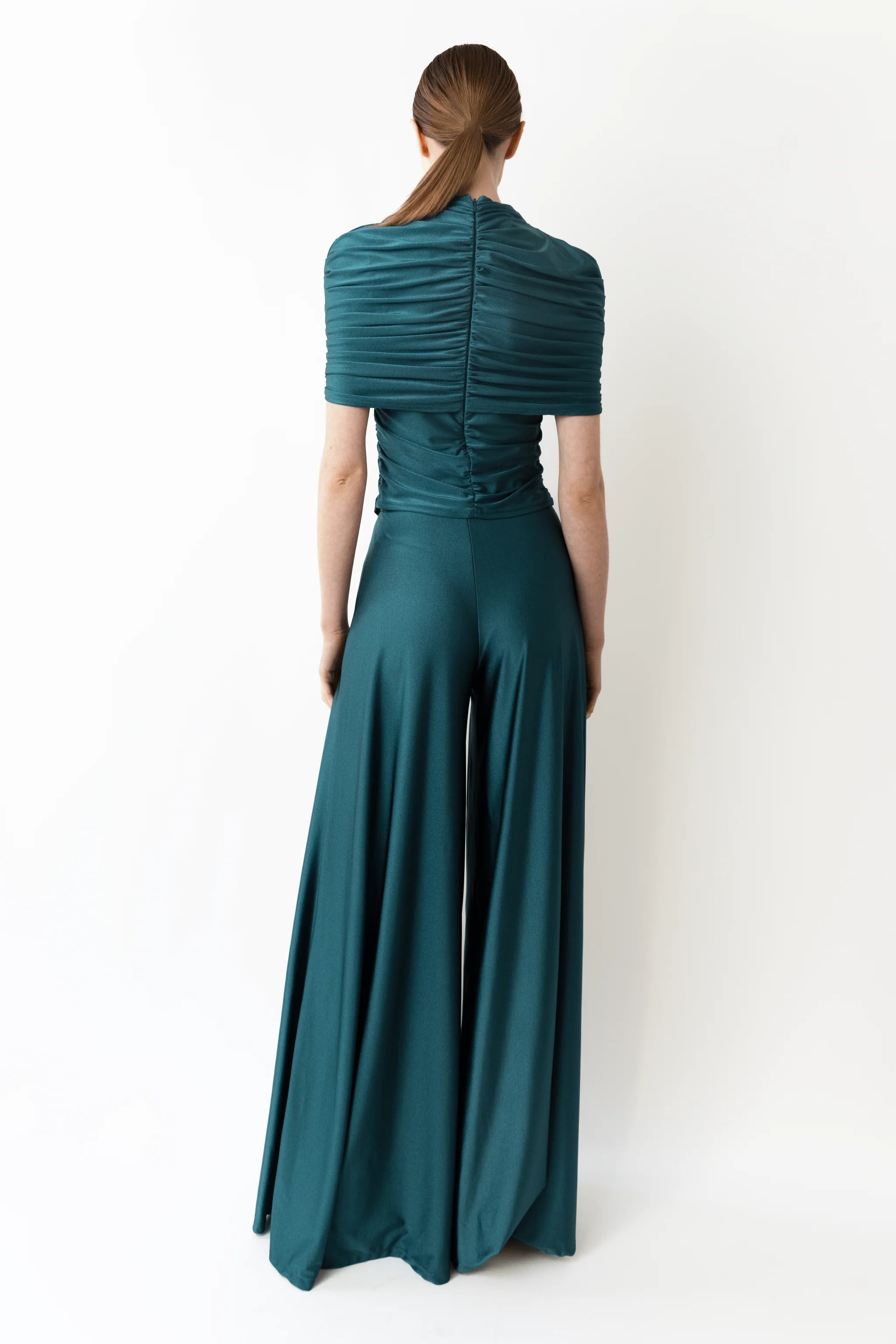 Wide leg pant in our shine jersey fabric with side slit pockets. Sits at the high waist and features an invisible zipper closure on the side.
