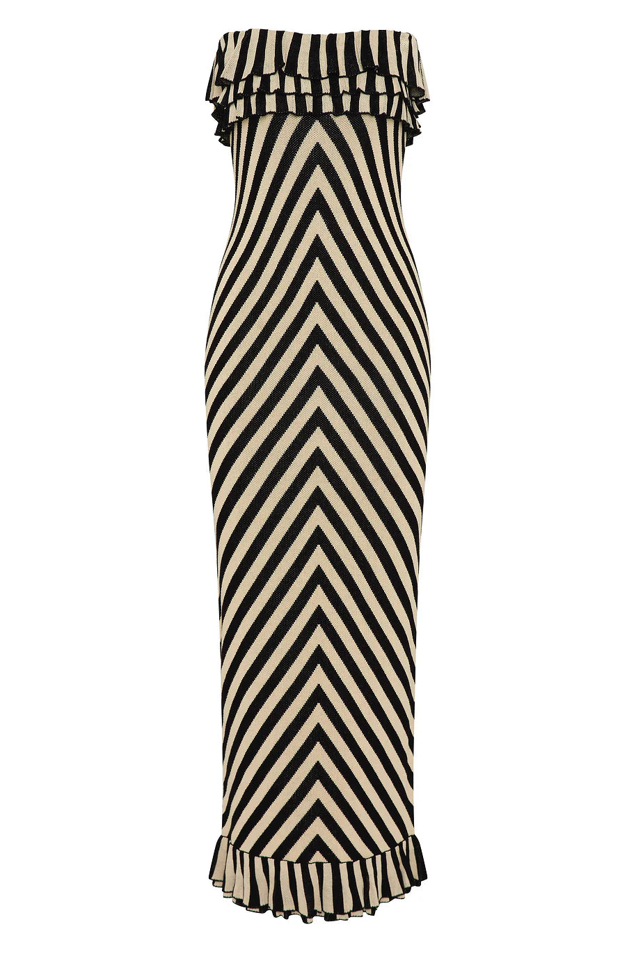 The Miles Dress is crafted from a soft knit, featuring directional cream and black stripes. Designed with bust and hem frill details, it has a close, figure-hugging silhouette.