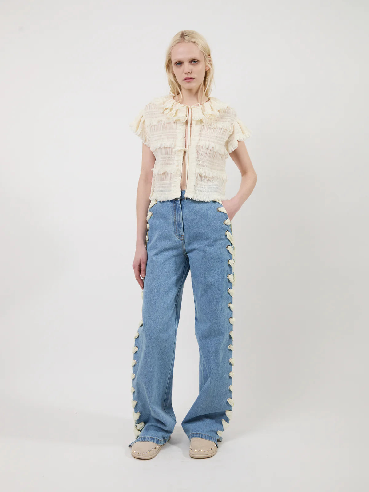 Tied front ruffle blouse in micropleated sequin chiffon.