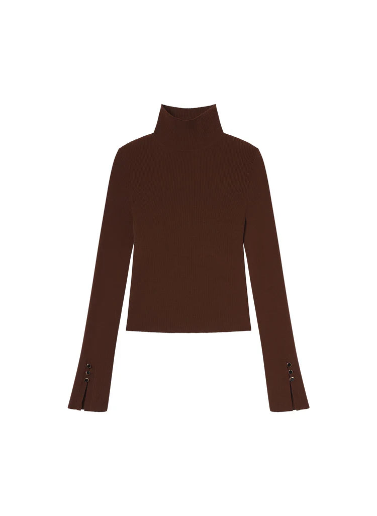 A slim-cut essential, the Jett Top is a refined layering piece. Crafted from a soft, ribbed Italian yarn, it features a turtleneck and vented, gold-buttoned sleeves.