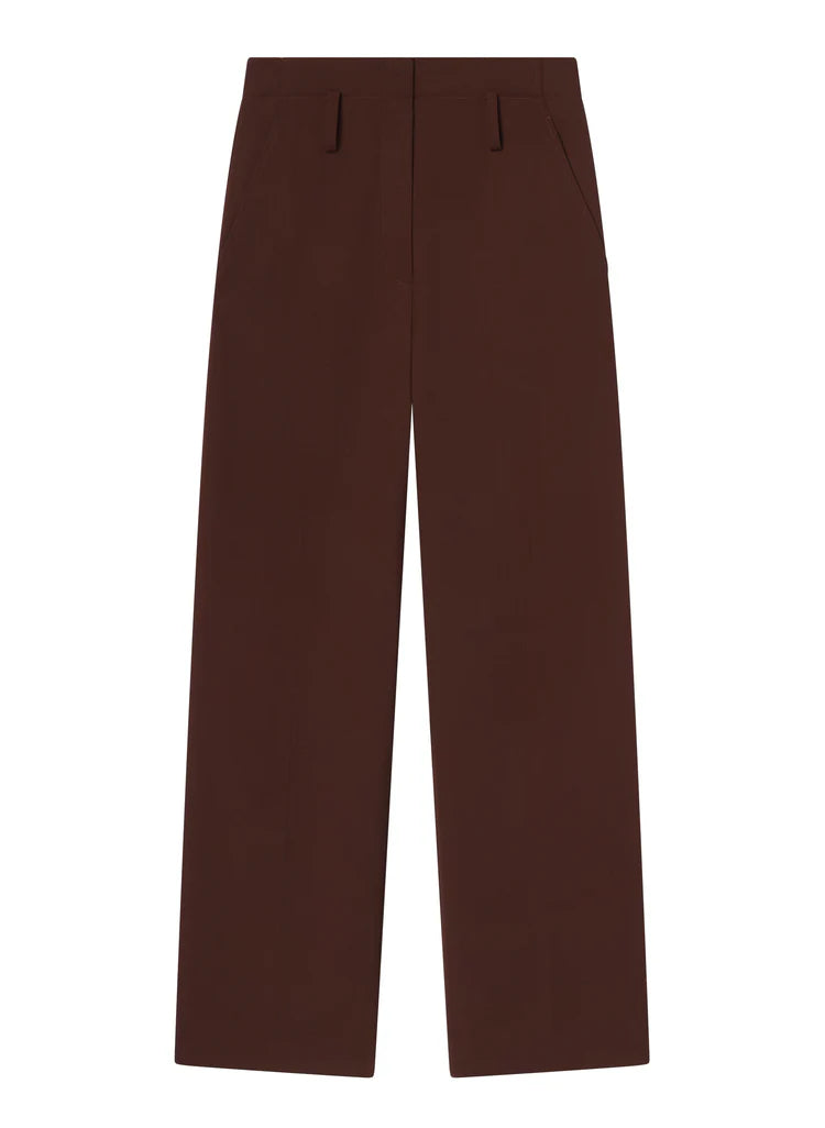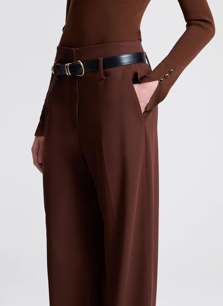 A relaxed silhouette rendered in drapey wool gabardine with a mid waist and straight leg that falls with soft structure and fluid movement.
