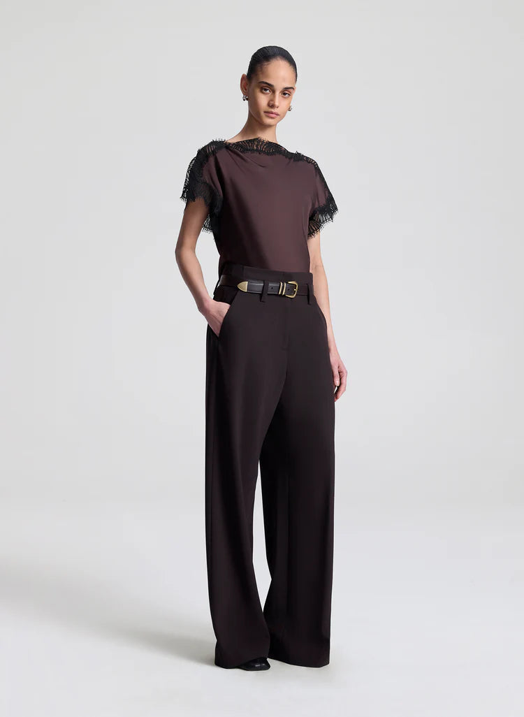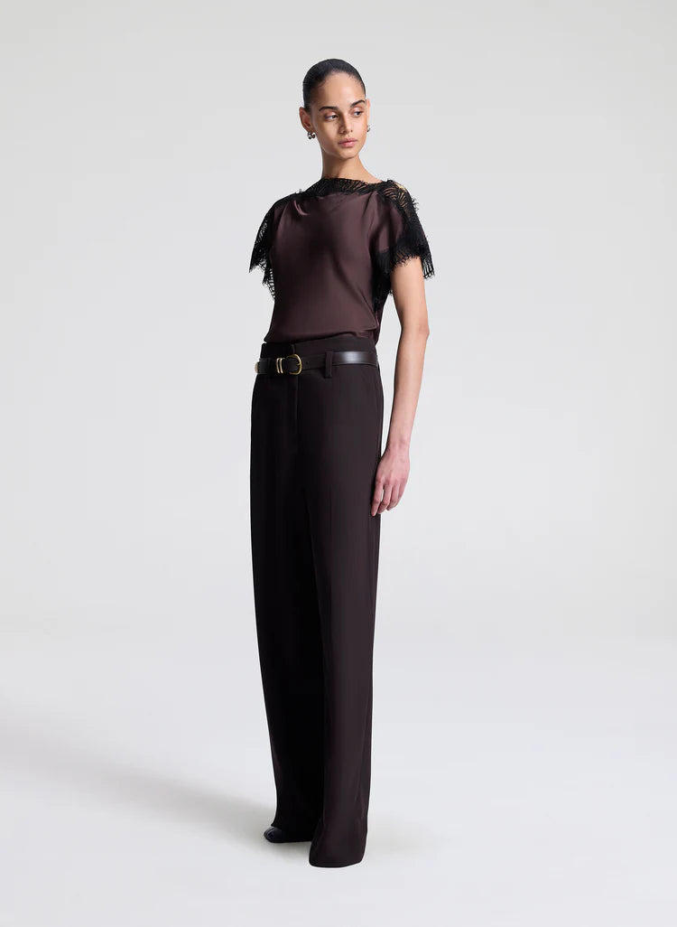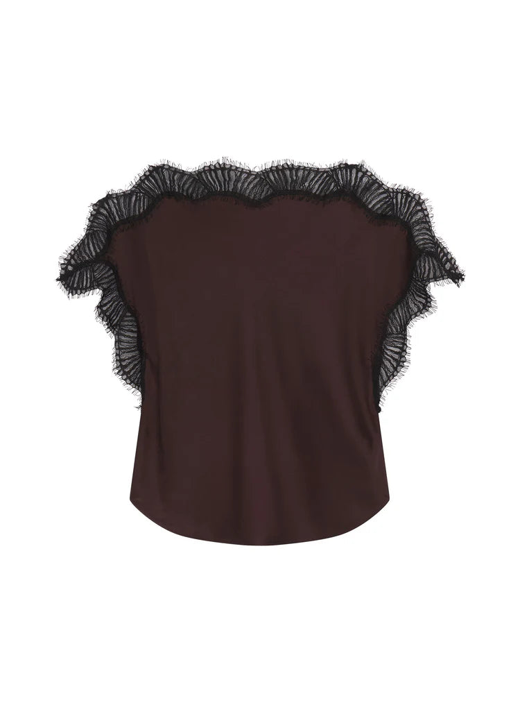 Scalloped eyelash lace trims this fluid viscose top with a bateau neckline and flutter sleeves.