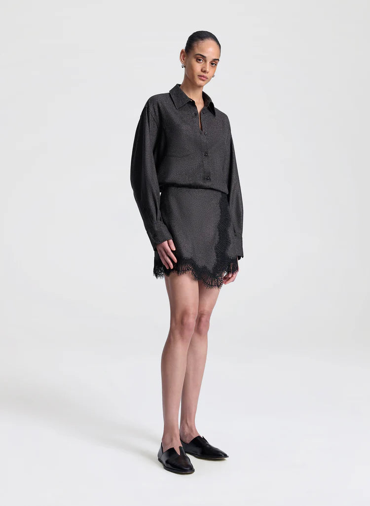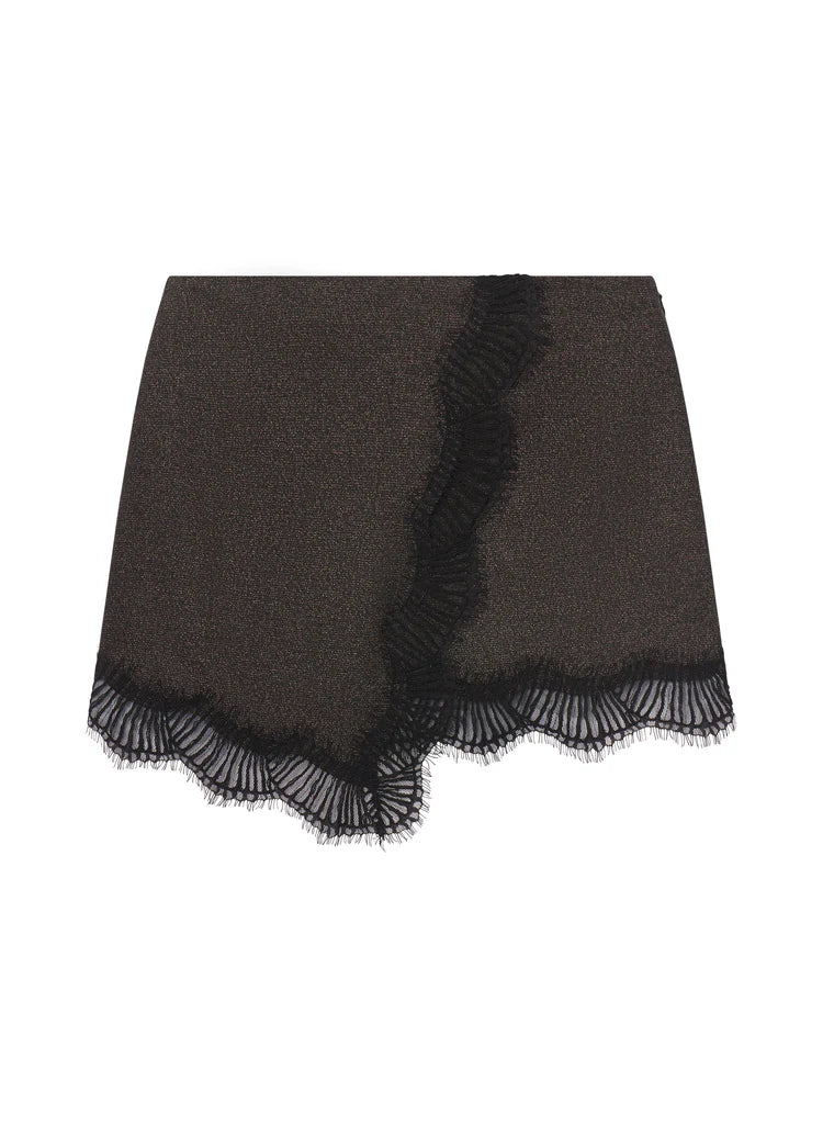 A wrap mini skirt cut from softly structured woven stretch mouliné tailoring, finished with delicate eyelash lace.