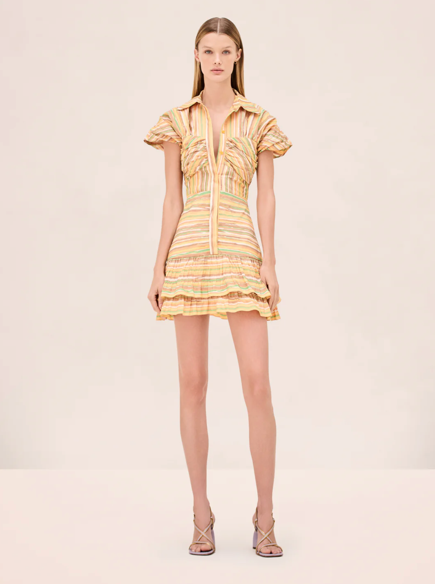 This ALEXIS mini dress features a collared neck, short cap sleeves, and a ruffled hem. It is designed with ruching at the bodice and a covered button placket. It has a mini length and is crafted from mid-weight, non-stretch weave.