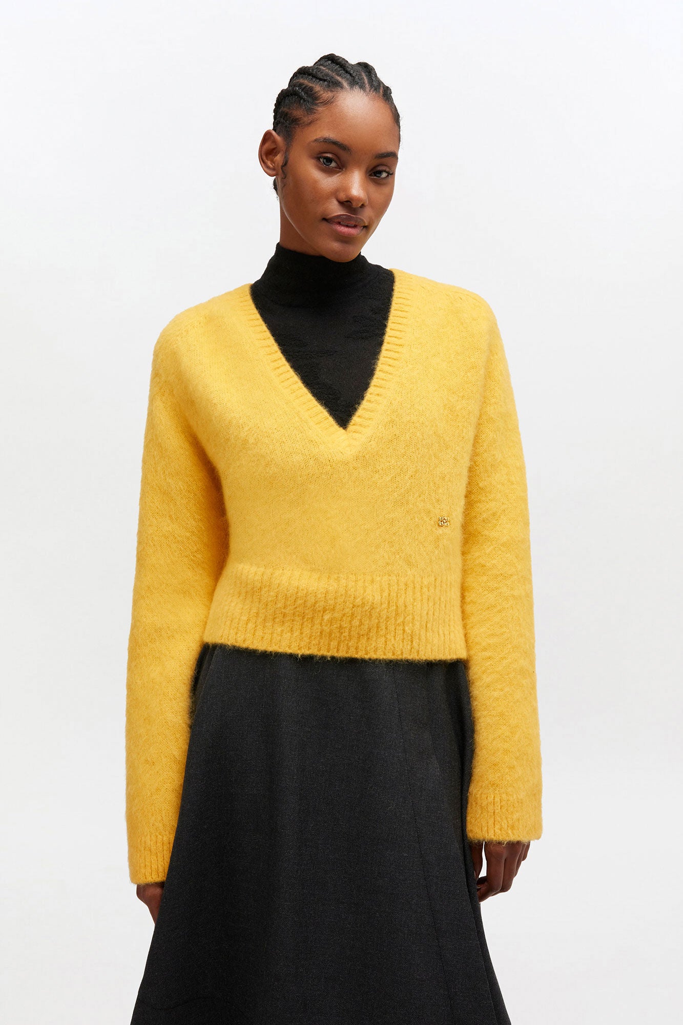 This sweater features a deep v-neckline, long sleeves with rib edges and a GANNI Butterfly logo at the side.