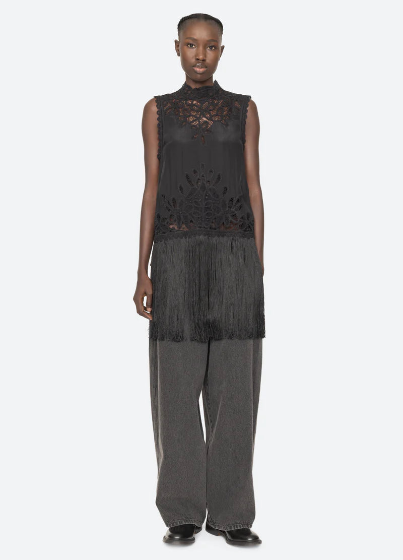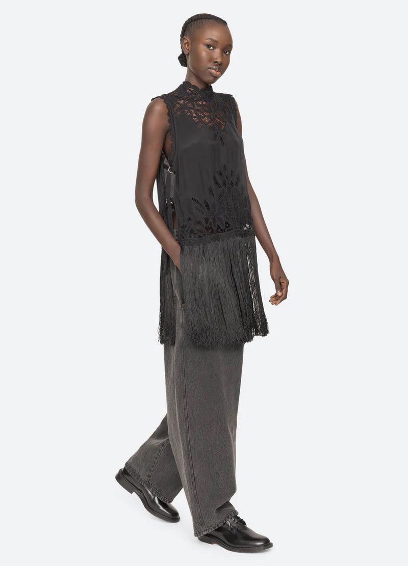 The Adelina lace top features a turtleneck and adjustable D-ring tabs on the sides, adorned with flowing fringe and intricate battenberg lace. Semi-sheer sections of the lace add a romantic quality to this striking, statement-making piece.